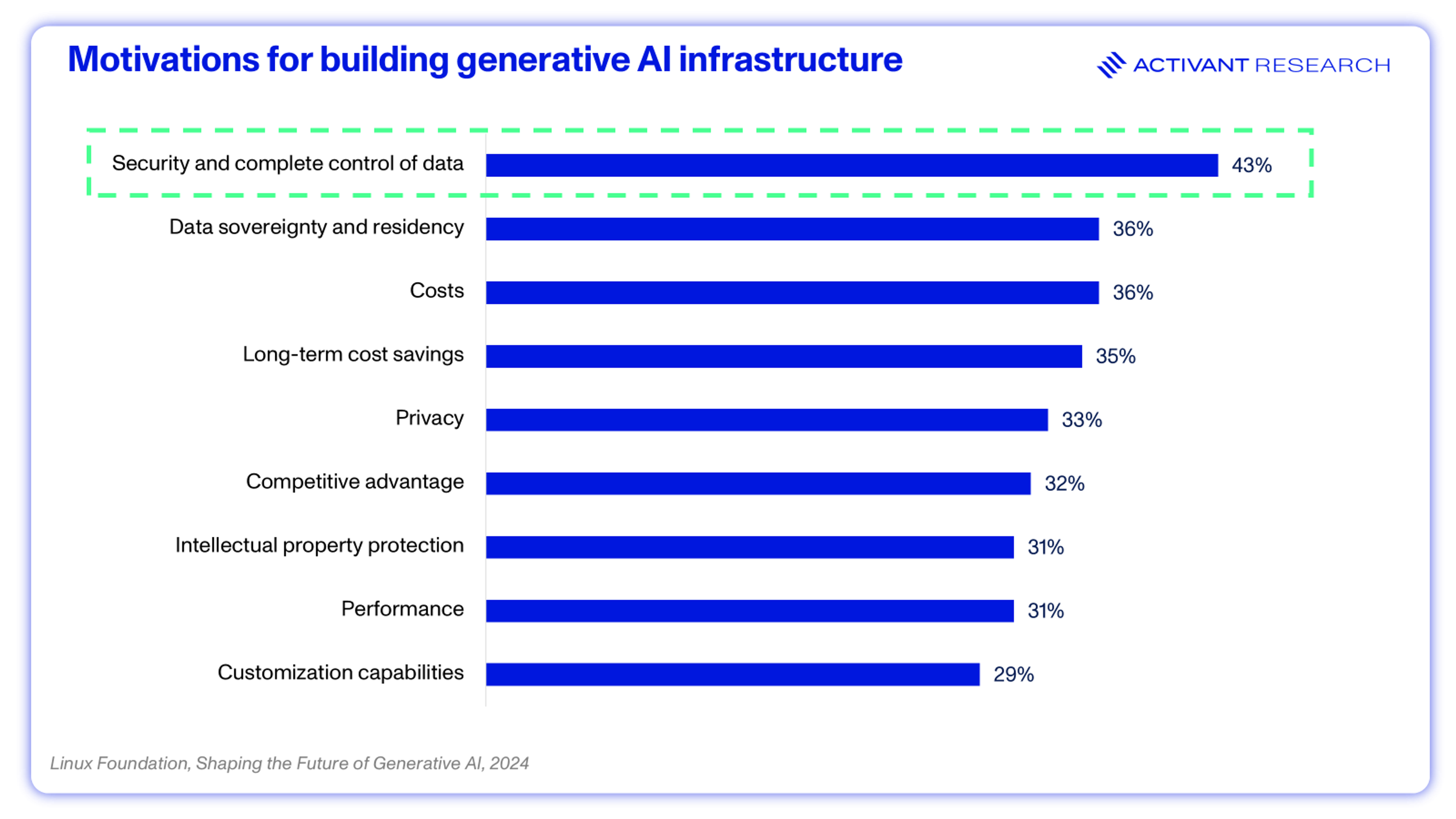 That’s why data privacy and security are the most cited barriers to Generative AI adoption, the top challenge when implementing RAG, and the primary motivation for building an entity’s own Generative AI infrastructure.24,25,26