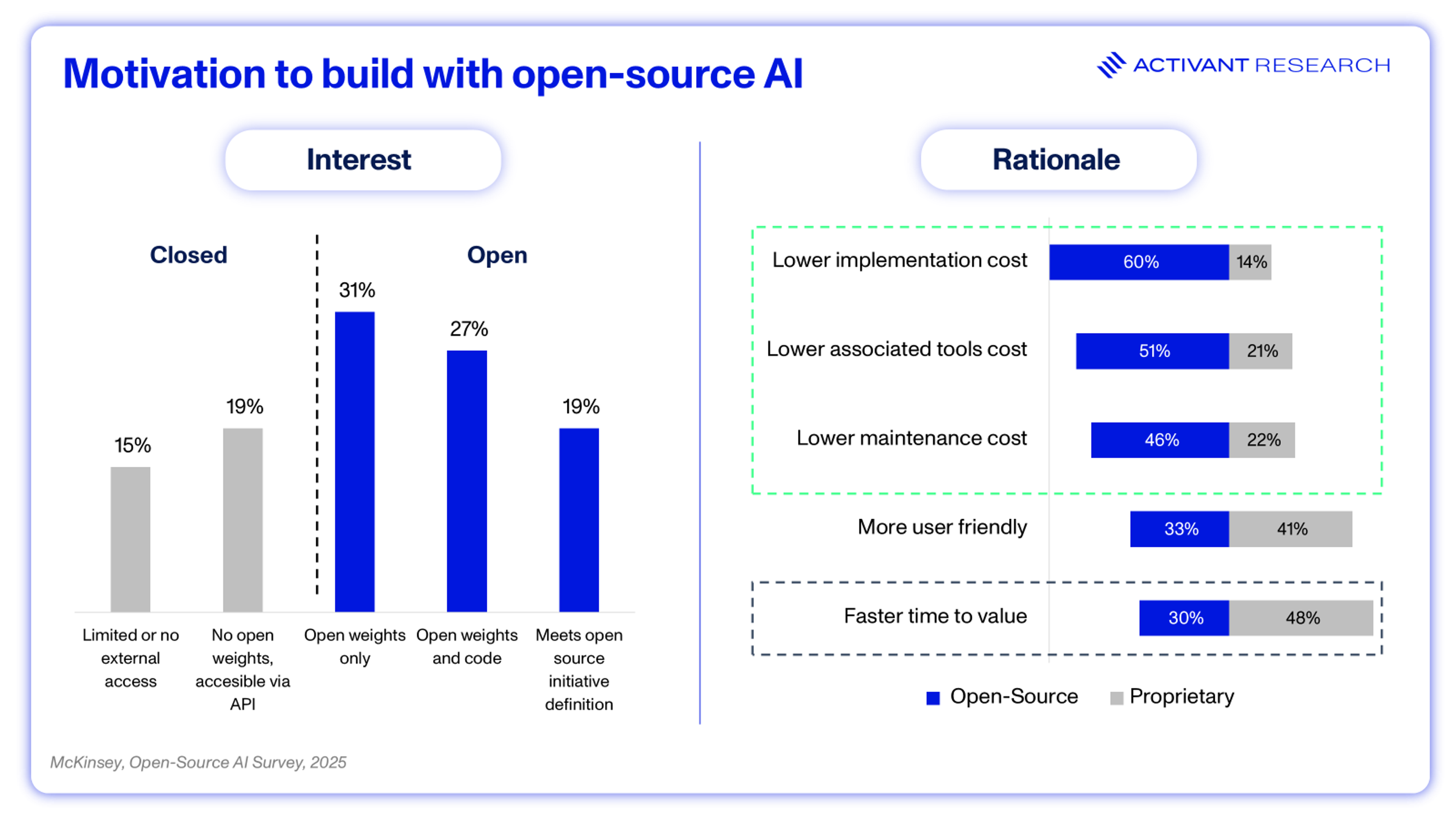 While closed model APIs might hold the lead in the enterprise today, developers want open source AI. 83% of organizations believe that AI needs to be increasingly open and 73% of organizations expect to increase their use of open source generative tools.29 In fact, it might be the case that the main reason closed source is winning today is faster time to value.