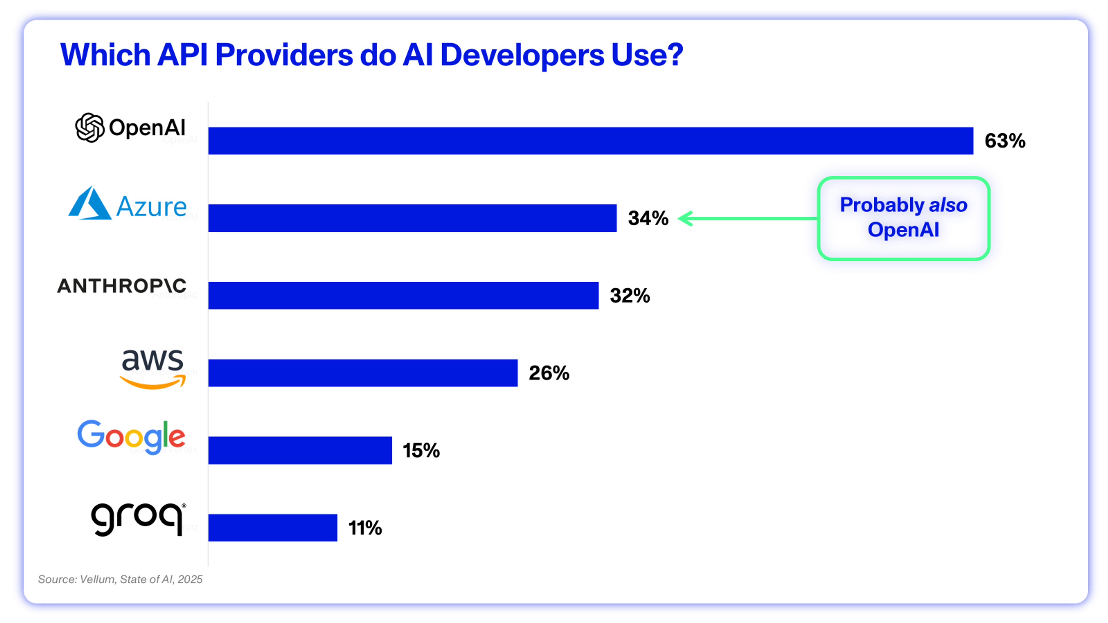 Not only do these providers offer state-of-the-art models, but they also deliver fully integrated stacks: they deploy the underlying GPUs/TPUs, optimize the infrastructure stack, and wrap it all up so that developers can add AI to their products with a simple API call. Unsurprisingly, there is strong crossover to leading in API inference—OpenAI clearly leads developer mindshare, with 63% of developers using its API.4