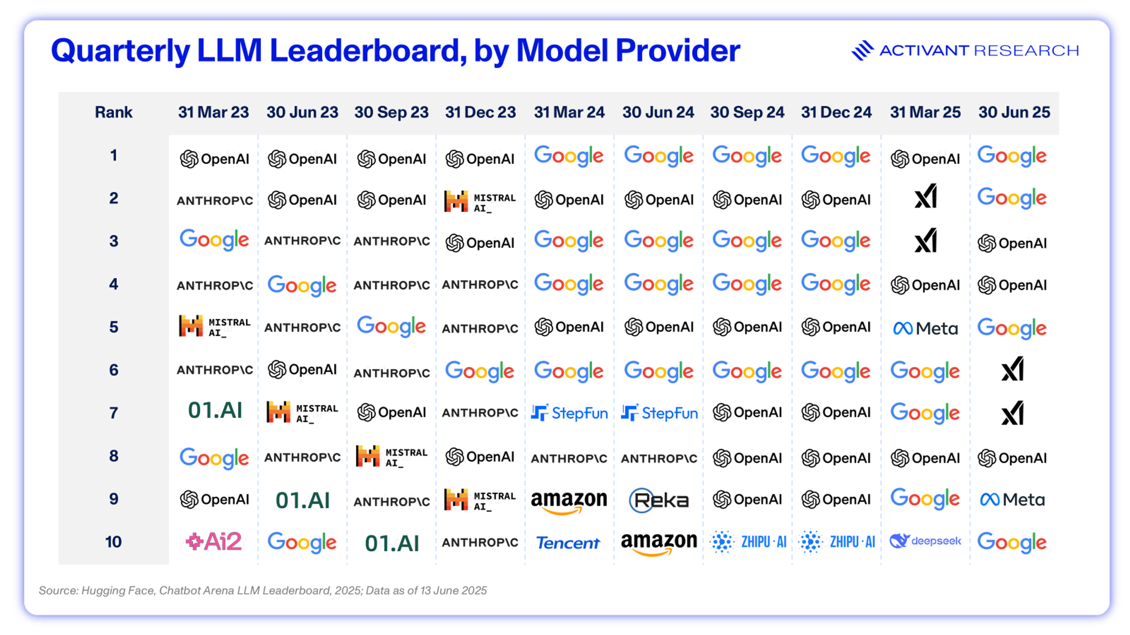 However, good UX and product engineering alone are not what earned these companies their position. In fact, Google might be exceptionally weak in the product department, relying heavily on its technical strength. AI users are fickle, and leadership is backed up by leaderboard dominance. Consider LMArena, a leaderboard often referred to as the “industry’s obsession” and even referenced in official Google conferences. Since its inception, the top spots have been almost entirely held by Google, Anthropic, and OpenAI.