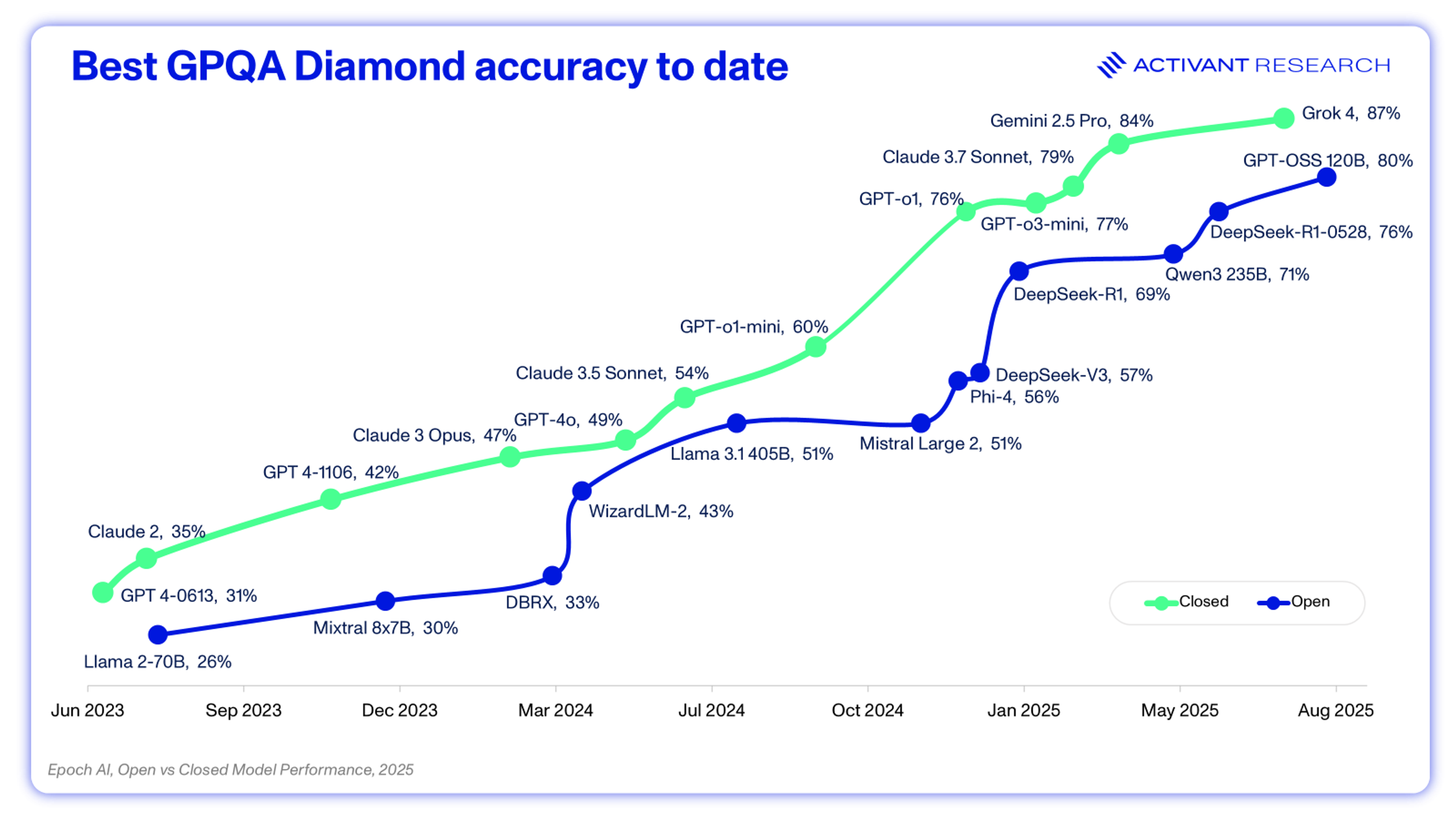 In today’s AI paradigm, closed source models built by research labs with $10bn+ budgets dominate benchmarks and leaderboards. However, open source models are rarely far behind, typically matching performance within 6 months. This performance parity matters because history shows that demand for cost, performance and customizability will push the balance toward open source, but only if these models can keep up.
