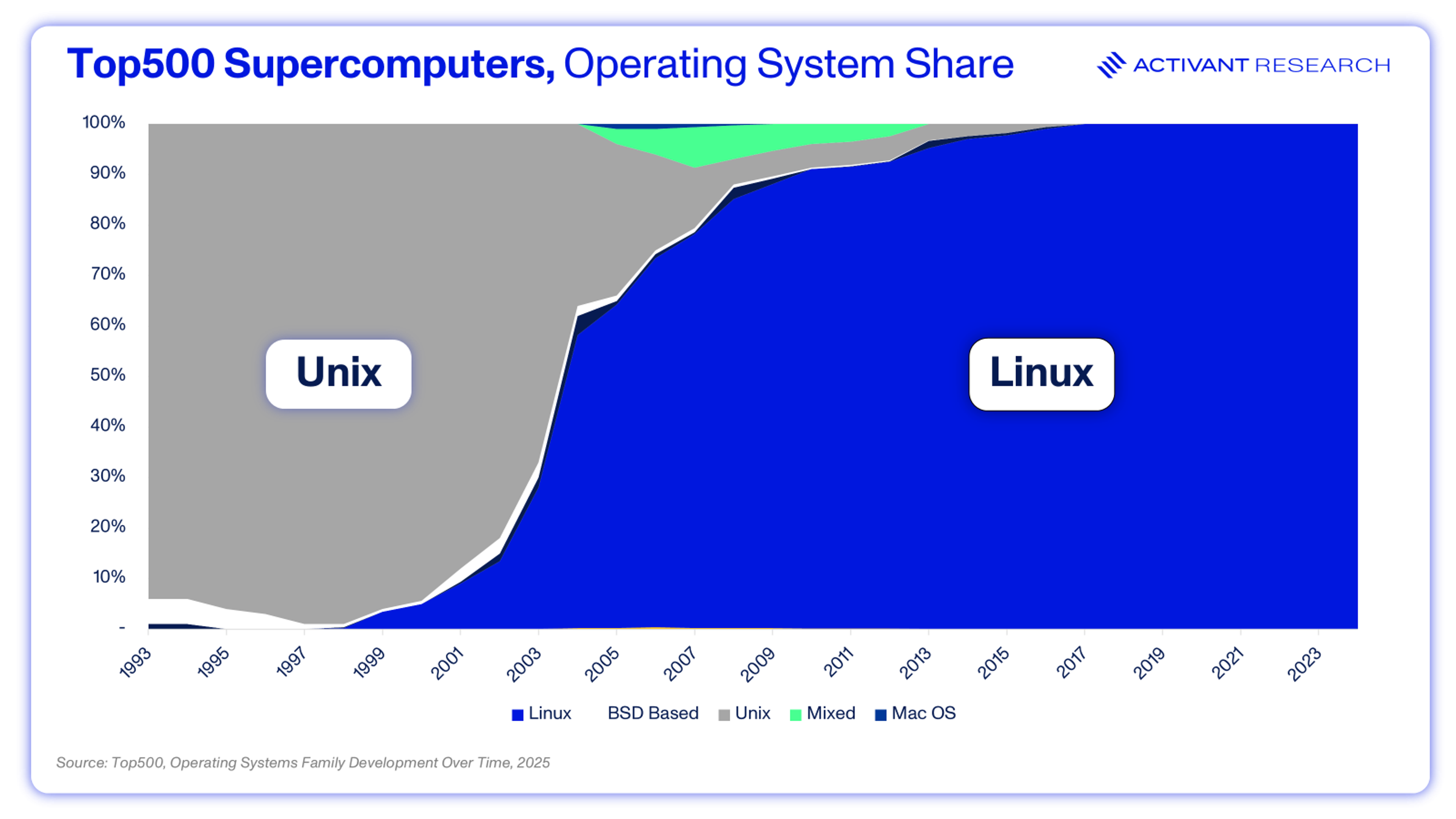 Windows dominates the PC operating system market with 70% share, while Linux lags at only 4%.8 But turn to cloud infrastructure, and Linux starts to flip the script, holding >60% of the server OS market.9 Linux’s open source and modular design allows developers to install only the essential OS components and maintain granular control over the kernel, services, and libraries, creating highly optimized, lean, and secure server environments. When users need deep customization and control, tech tilts toward open source. To drive this point home, consider the Top500 supercomputers, where every single floating-point operation per second matters: Linux claims 100% market share.