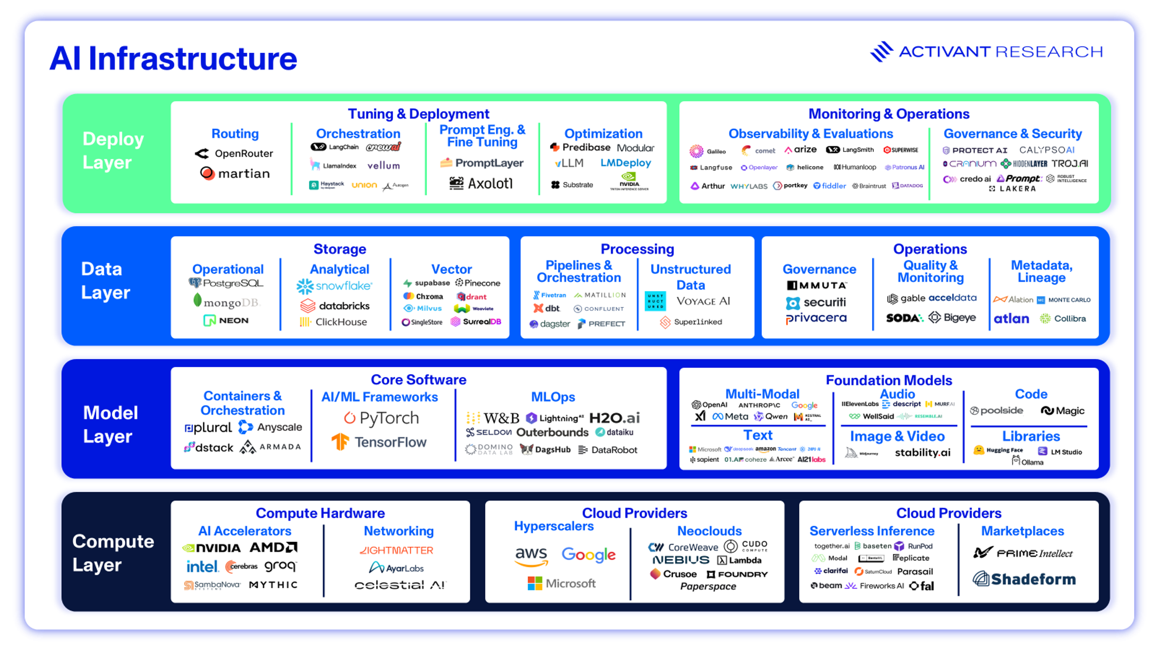 Data is, of course, one of the key inputs to AI training. In enterprise AI infrastructure, the Data Layer is critical at inference time - Retrieval Augmented Generation (RAG) can boost performance even more than fine-tuning or prompt engineering.29 As we’ve noted before, RAG enables enterprises to tap the 80%+ of unstructured data that was previously ignored, giving rise to a new unstructured data pipeline. Unstructured.io automates the retrieval, transformation, and staging of unstructured data for LLMs, while Voyage AI’s embedding and reranking models can improve RAG accuracy and reduce the cost of vector storage 3x.35
