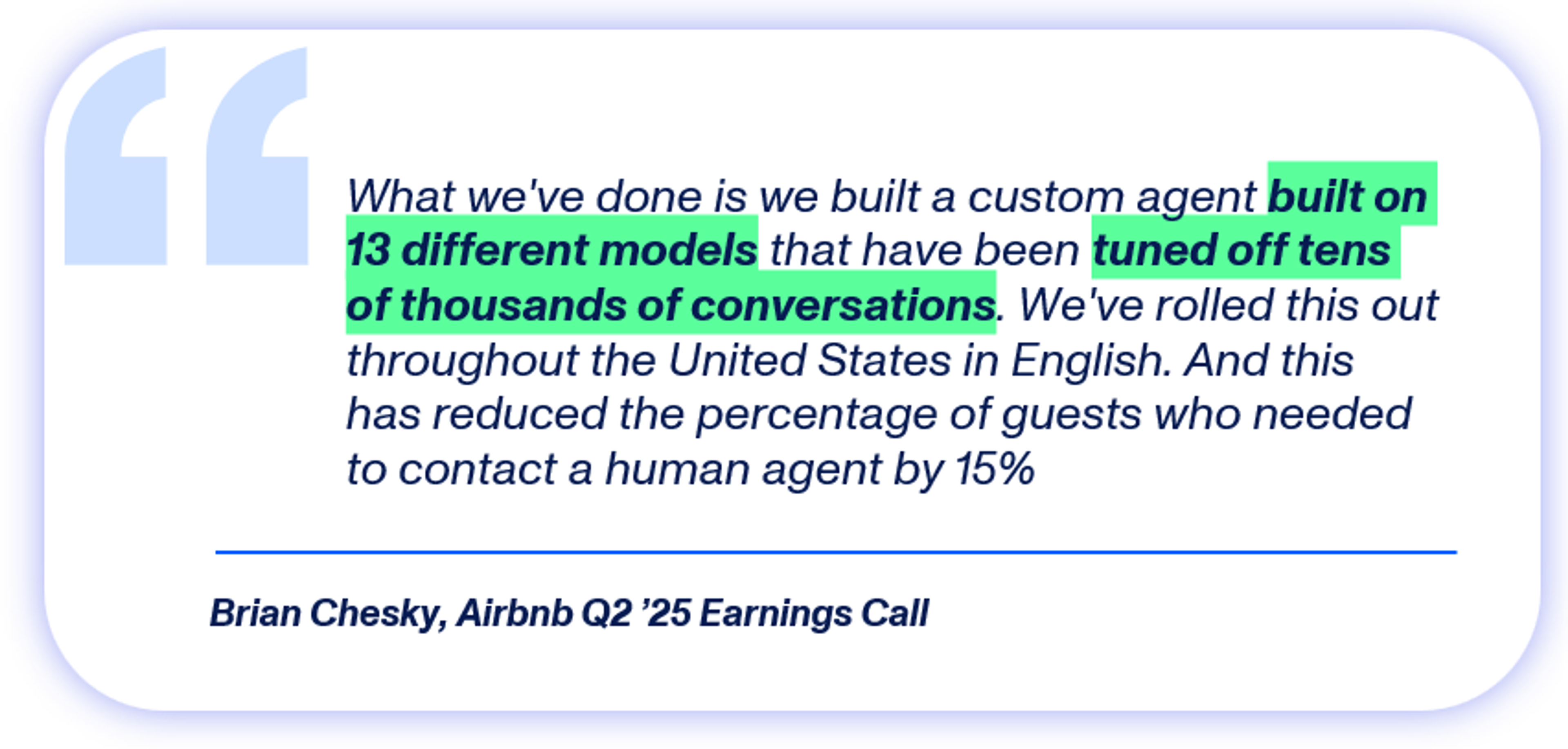 This is not just academic. ChatGPT itself is a system that leverages OpenAI’s largest foundation model along with the Dall-E image generator and a code interpreter. FactSet’s text-to-financial-formula tool hit a quality ceiling until they implemented a compound AI system: a fine-tuned open source model handles user queries, embeddings are created for formula retrieval, second model re-ranks the formulas, and a large model generates the final output.31 Similarly, Airbnb’s new customer service tool employs 13 different models:
