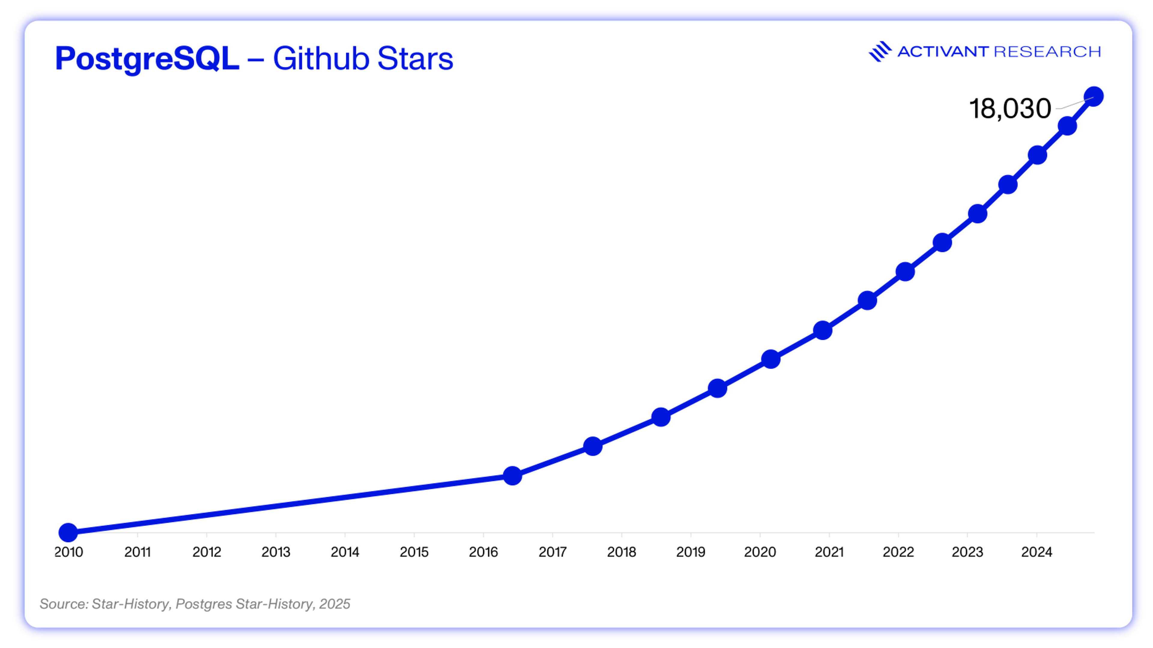 Infrastructure tools are most likely to have technical users, with high customizability requirements and a sensitivity to costs as they scale. Tying together the points above, infrastructure tech tends toward openness. It’s also key to note that infra tech is often about creating standards, where ease of adoption is key, and providing a tool for free is a great way to bootstrap adoption. From Apache Kafka (used by >80% of the Fortune 100), to PostgreSQL, the list is long.13 The case of Postgres also leaves us with one more lesson: the tide can turn. For a long time, the database market was dominated by the early closed source innovators in Oracle and MySQL. However, as the tech commoditized over time, the ability to get 80% of the features at no cost became extremely compelling, catapulting Postgres into the position of one of the most popular relational databases.