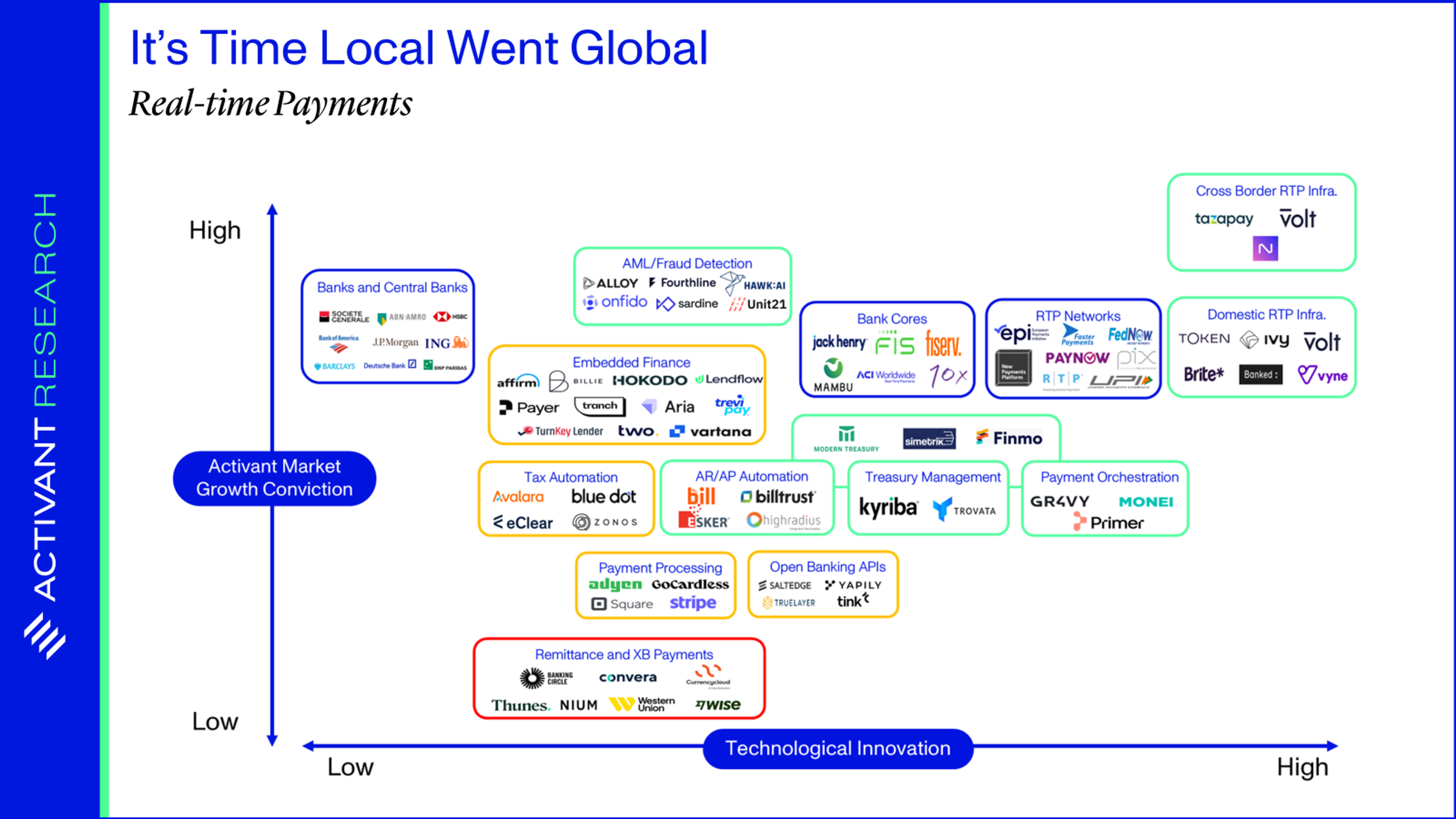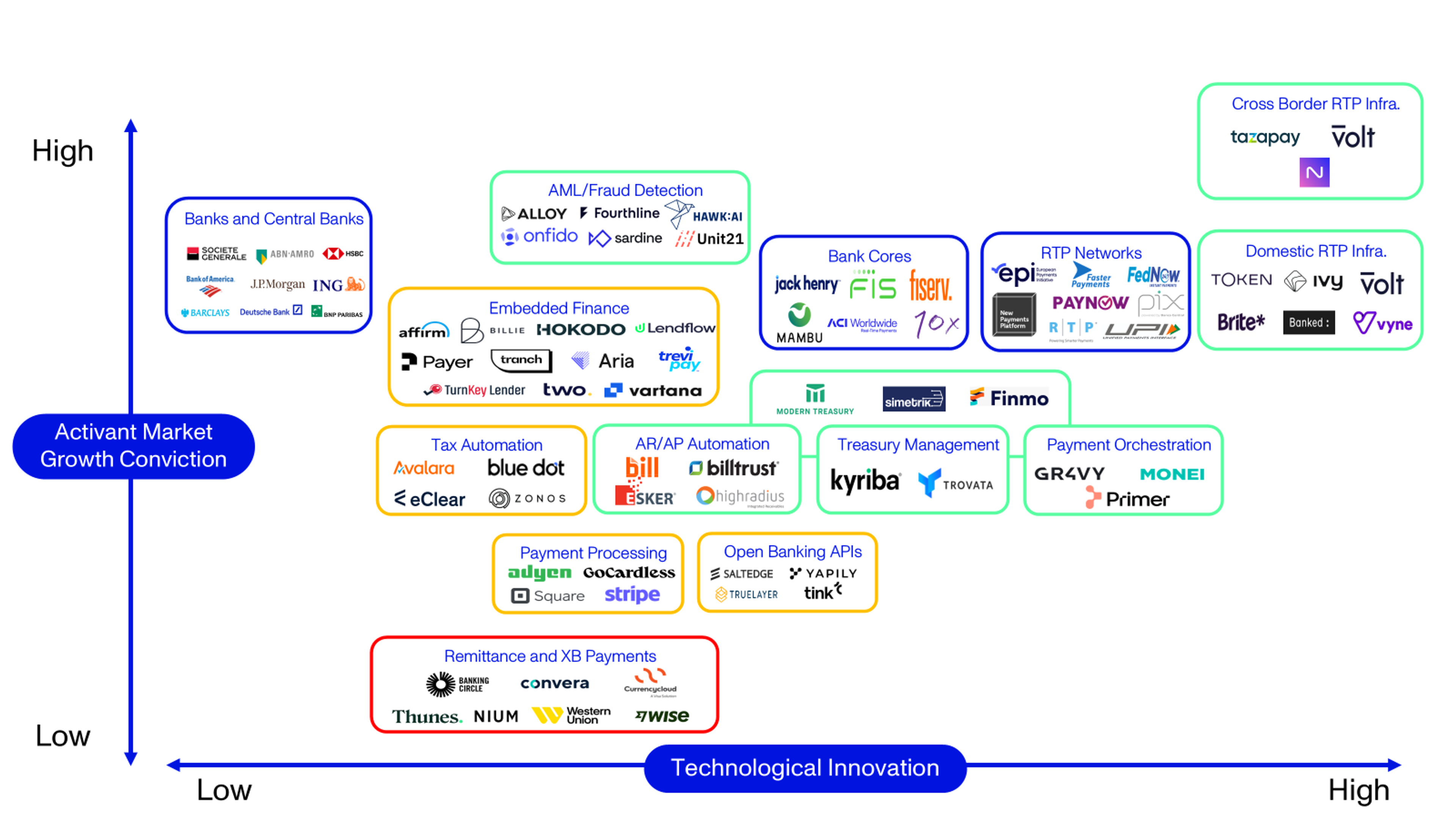 Our Activant Thesis Map, shown on the next page, summarizes our market growth conviction and the degree of technological innovation for each of the distinct clusters of companies. We are most excited about the growth prospects of RTP infrastructure providers and the overlay service providers that build on or enable RTP transactions. These sectors are shown in green on the thesis map. We believe that RTP networks will grow and take market share away from many of the current payment rail systems, but these are often national solutions developed by central banks (like FedNow in the U.S.) or networks of banks (like the Zelle network in the U.S. or the European Payments Initiative in Europe) so we excluded them from consideration. Similarly, we believe that the FIs holding the primary account relationships will benefit at the expense of remittance and cross-border payments players if they offer RTP options that are competitively priced.