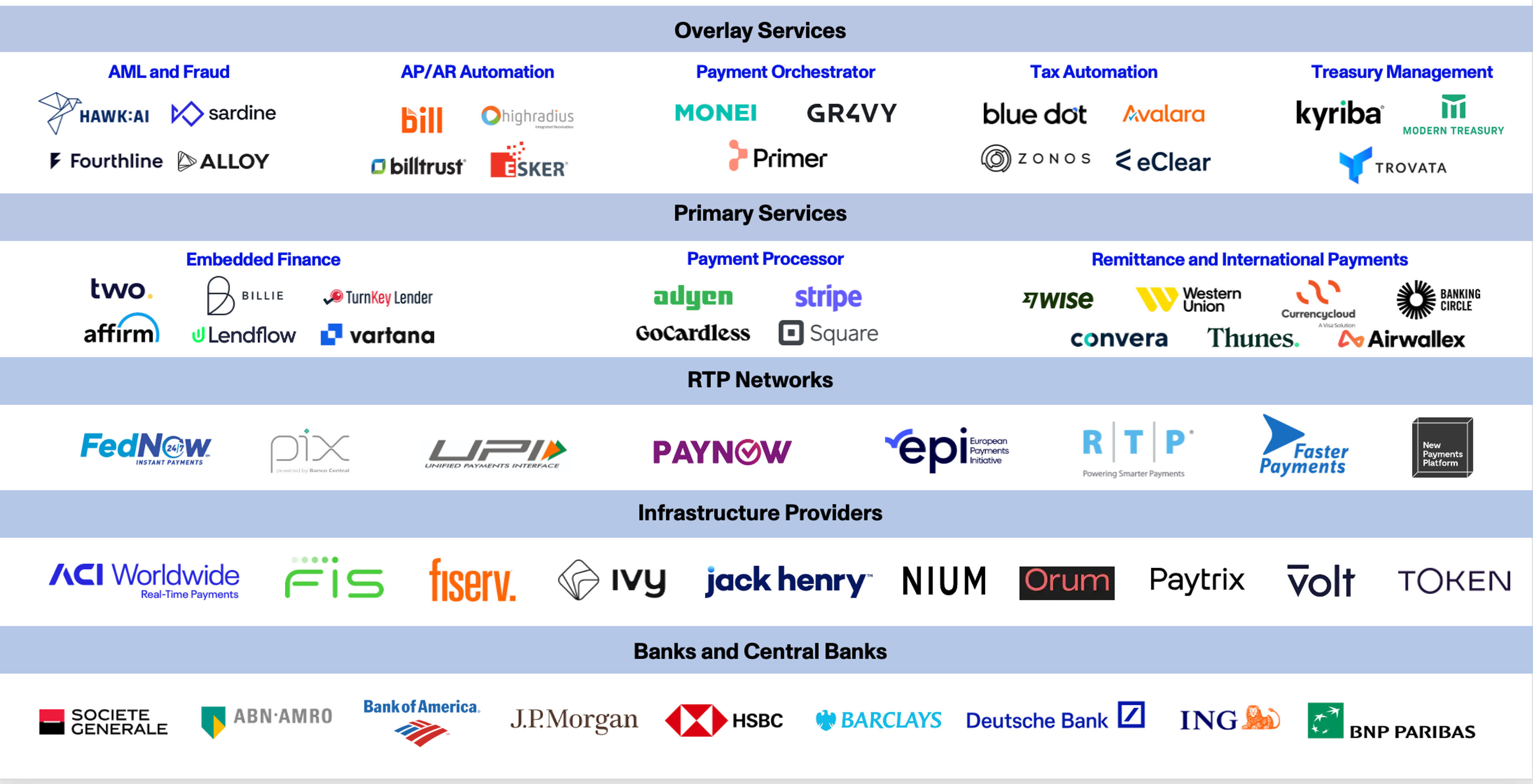 - Overlay Services built to provide solutions addressing a myriad cash and payments related needs – from AR/AP automation to Treasury Management and Payments Orchestration – offer opportunities to improve the efficiency of payment flows through connections to RTP networks. Activant is an investor in Gr4vy, a payments orchestrator. We also like Modern Treasury’s unified payments platform that includes connections to FedNow and other RTP networks.
