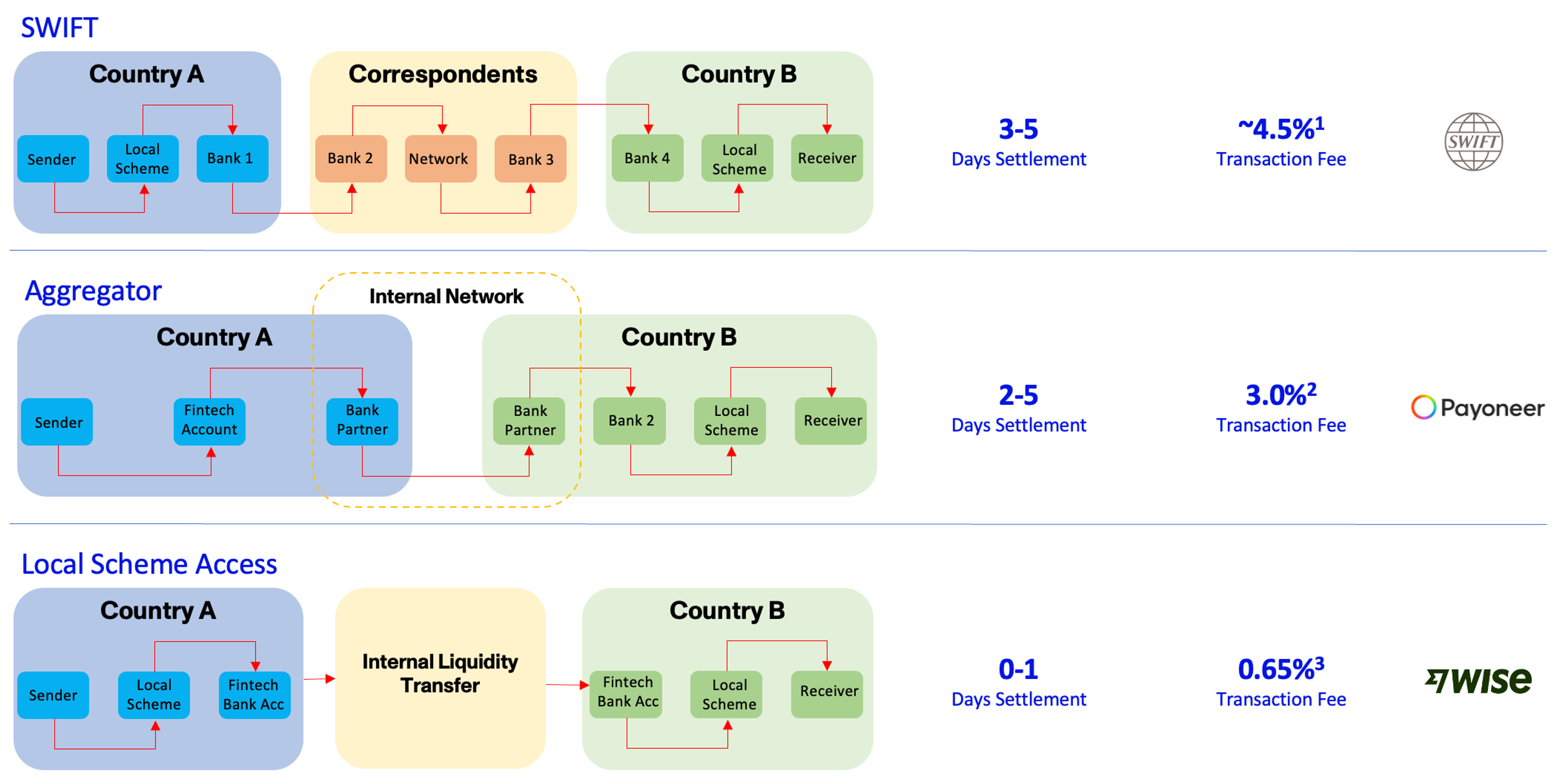 The diagram below illustrates some of these disadvantages by providing an overview of the current cross-border payment process flows, the associated costs, and average settlement times.