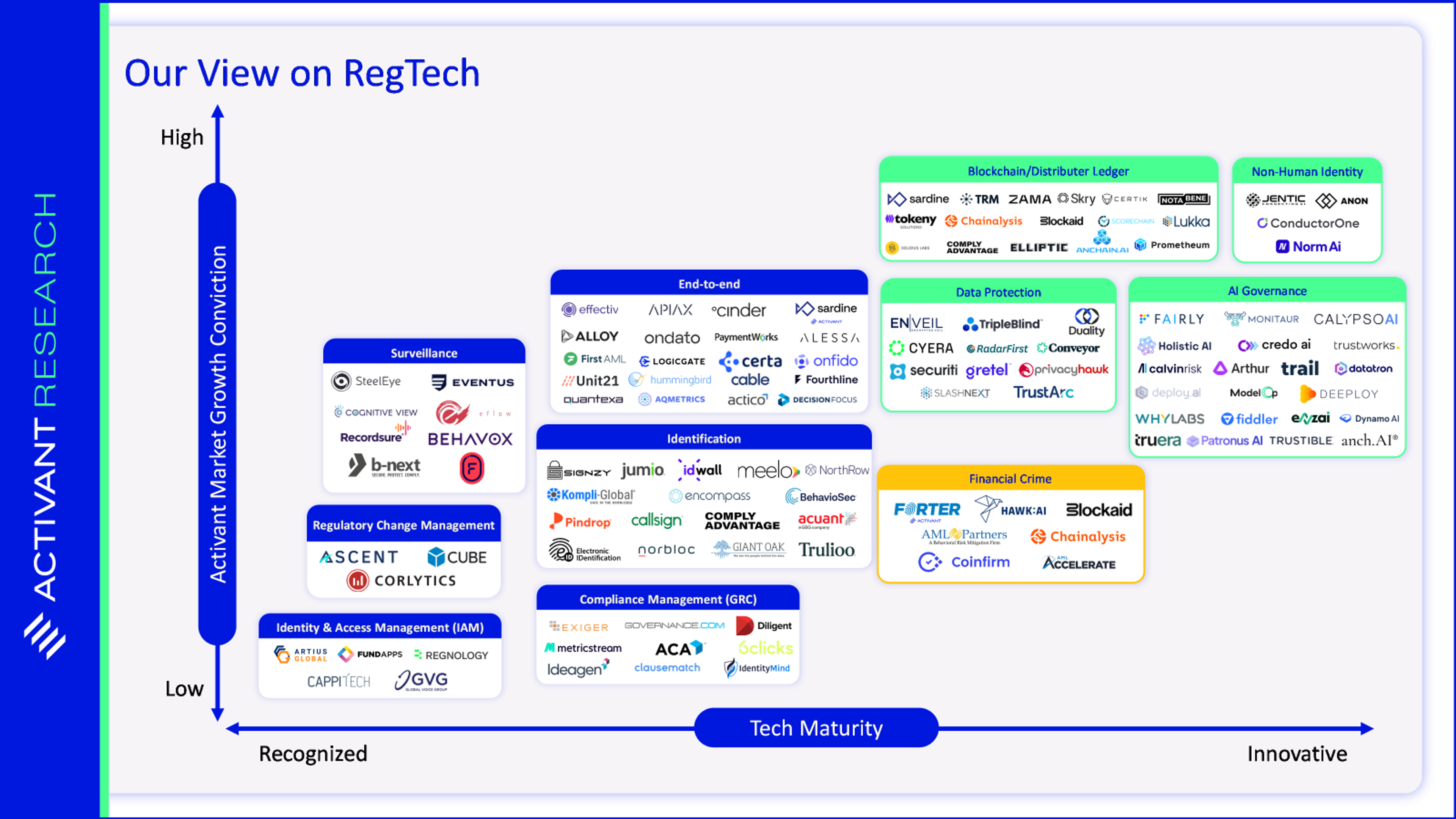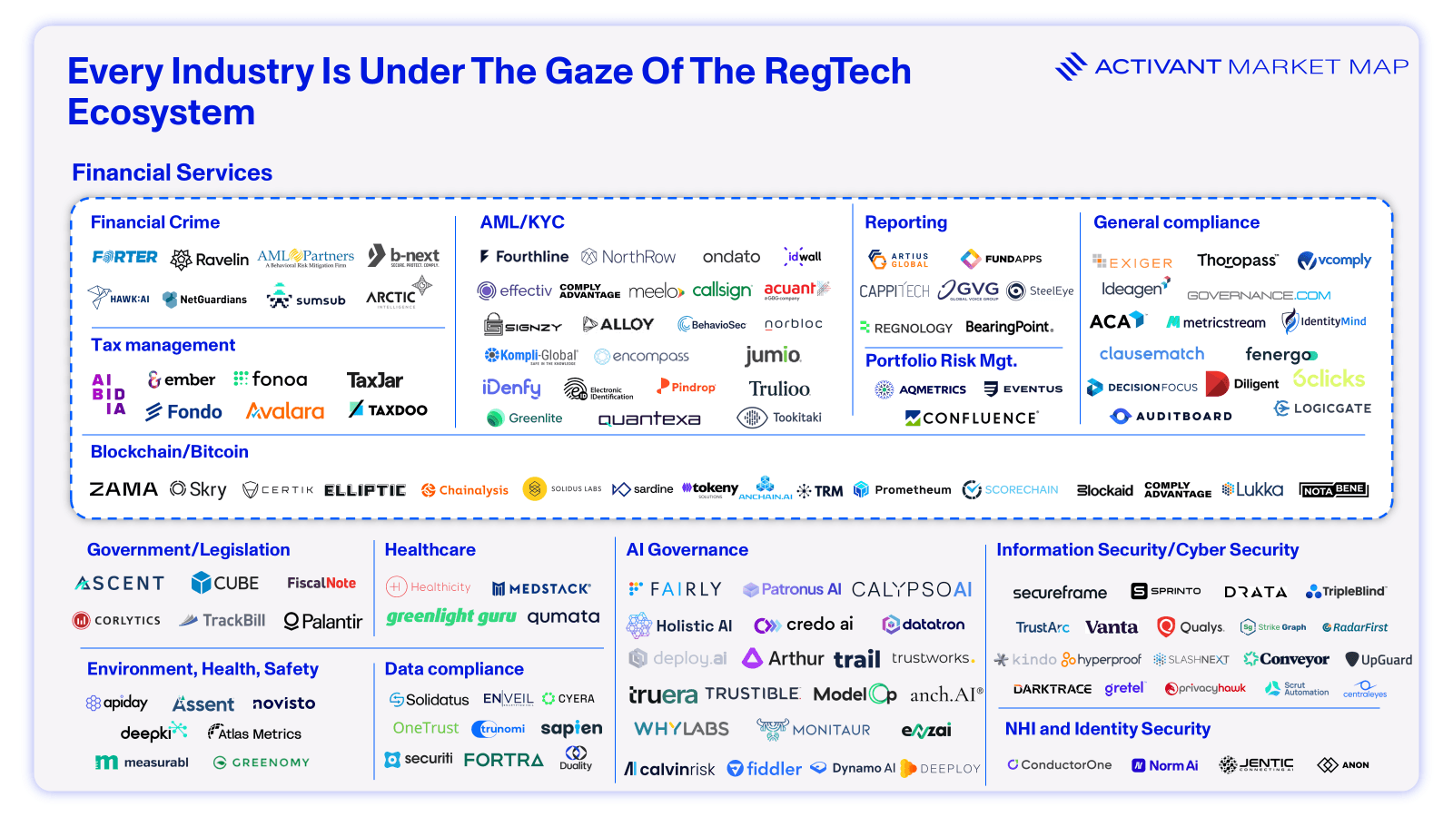 The global RegTech industry is projected to grow from $15.8 billion in 2024 to $83 billion by 2033, at a CAGR of 22.8%.20,21 While our market map is not exhaustive, at Activant we specifically see upside in financial crime prevention ($20bn market, 13% CAGR),22 AI governance ($300m market, 40% CAGR)23 and Cyber Security ($200bn+ market, 13% CAGR)24 – particularly within the realm of Non-Human Identity (NHI). For further insight into the Cyber Security market, see Activant’s latest research on Securing Non-Human Identity. While definitions and parameters may vary slightly across reports, we view this as a conservative estimate – especially as RegTech expands into new industries and use cases. The momentum is clear, positioning RegTech to become the foundation of modern compliance infrastructure.