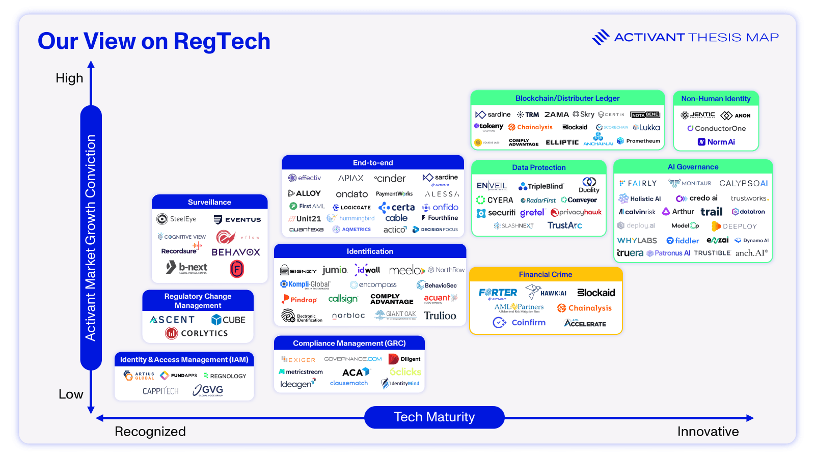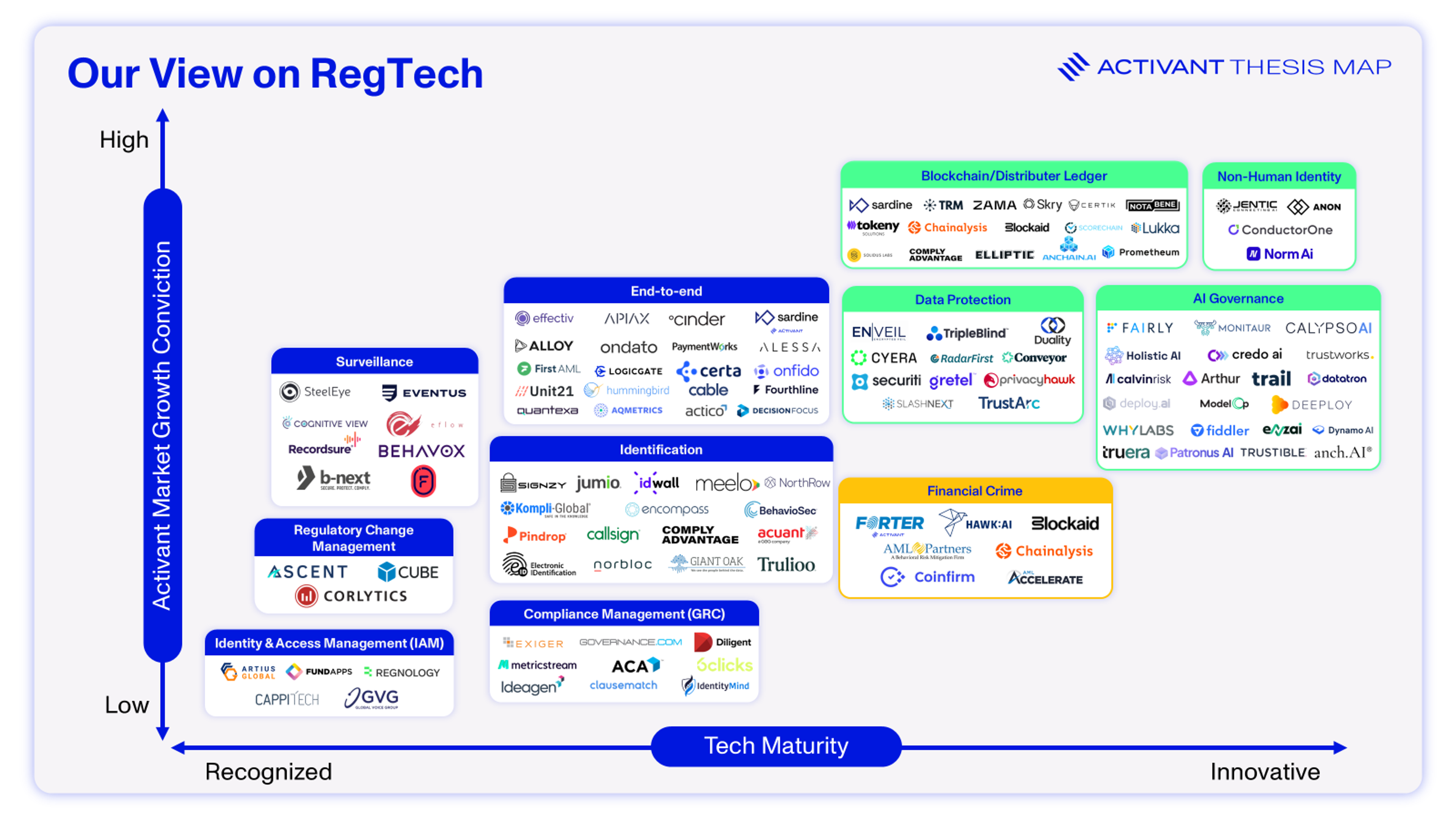 This is why RegTech isn’t just resilient, it’s mission critical. Unlike the broader fintech sector, which saw volatility in investment cycles, RegTech was the only fintech subsector to increase funding in 2022, jumping to $18.6 billion from $11.8 billion in 2021.2 Compliance isn’t optional and, as regulations shift, the demand for technology-driven solutions is only growing. The next frontier? RegTech is evolving to address new challenges and opportunities emerging from AI advancements and shifting monetary policies. With the global adoption of blockchain transforming B2B transactions, international payments, and distributed ledgers (on-chain recordkeeping), alongside the widespread implementation of AI across enterprises, new sectors in regulation have emerged. AI agents, non-human identities, and ethical AI considerations have opened a metaphorical Pandora’s box, necessitating new RegTech solutions. From AML and KYC/KYB to ESG compliance and data security, these technologies demand not only the conventional regulatory frameworks but also enhanced oversight to navigate the complexities of this new digital landscape.