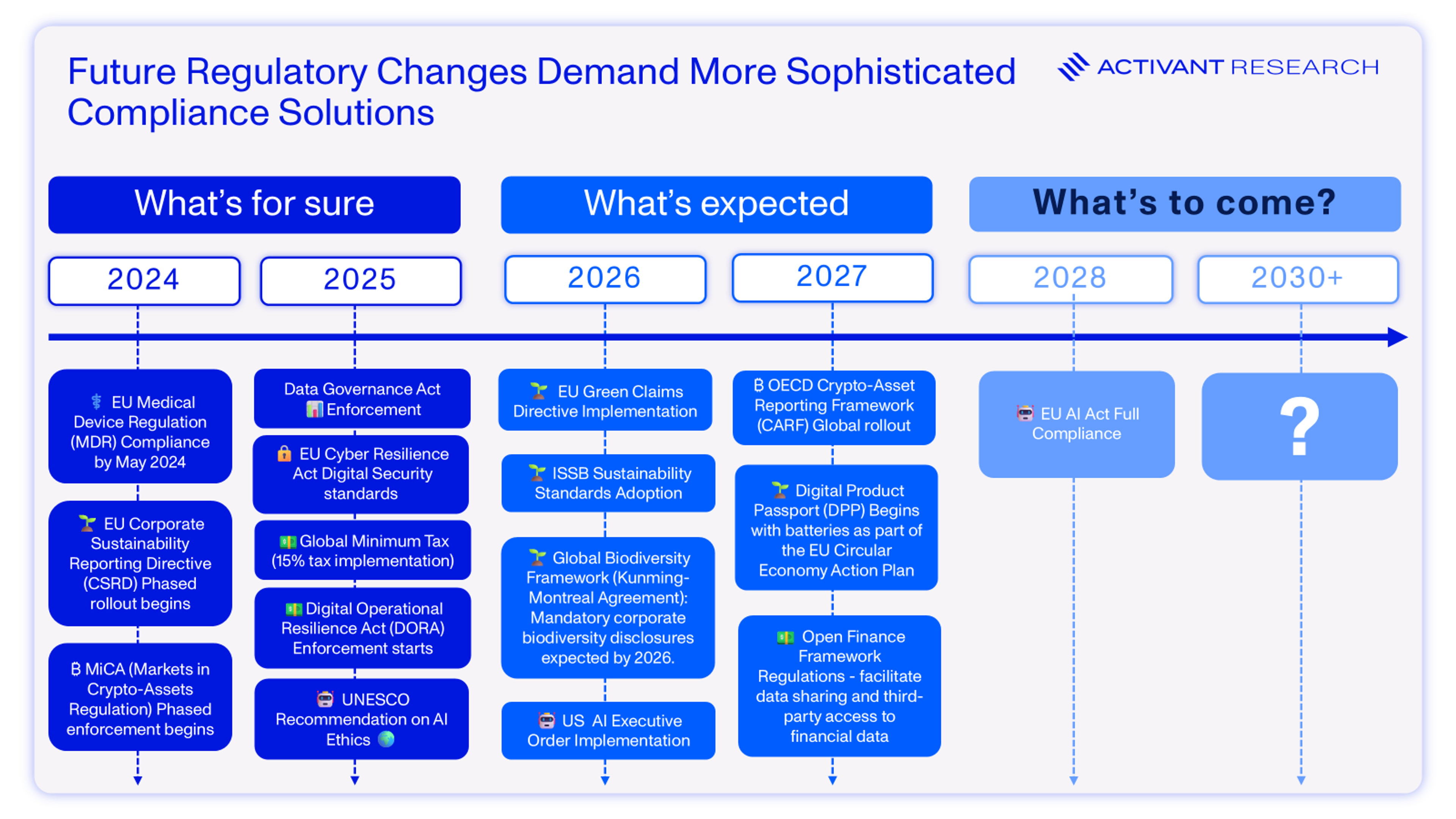 The landscape will evolve over the coming years, with meaningful milestones driving the need for more sophisticated compliance solutions. In 2024, organizations already faced key changes including compliance with the EU Medical Device Regulation (MDR), the phased rollout of the EU Corporate Sustainability Reporting Directive (CSRD) and Markets in Crypto-Assets Regulation (MiCA). By 2025, enforcement of the Data Governance Act, EU Cyber Resilience Act, and Digital Operational Resilience Act (DORA) will further tighten compliance demands, alongside global initiatives like the implementation of a 15% global minimum tax. Moving into 2026 and 2027, the focus will expand to sustainability and digital innovation with regulations like the EU Green Claims Directive, ISSB Sustainability Standards, and the Digital Product Passport as part of the Circular Economy Action Plan. Looking ahead, the EU AI Act is expected to achieve full compliance by 2028, signaling a broader push toward AI governance. These impending regulations underscore the growing complexity of compliance, requiring RegTech solutions that can adapt to dynamic global requirements and enable businesses to stay ahead of the curve.