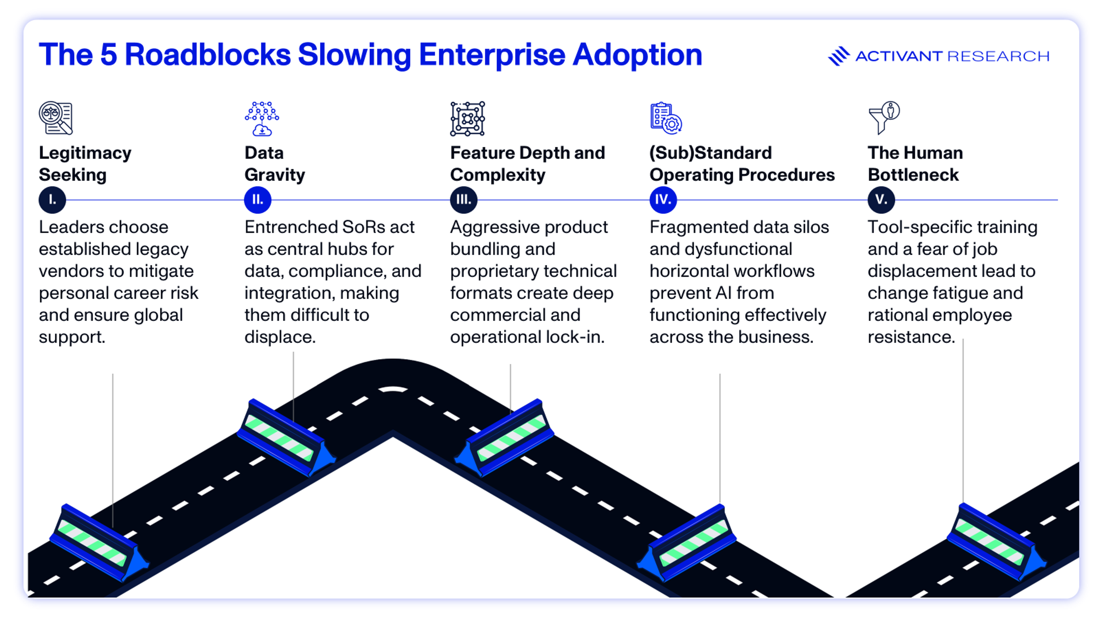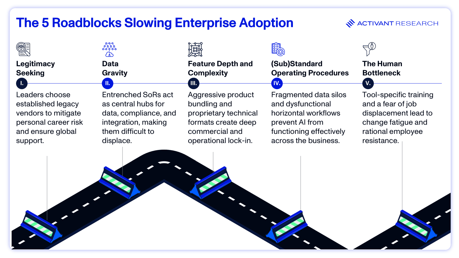 The critical complication is that this is not a simple AI-versus-non-AI battle. Incumbents are racing to bolt AI onto aging tech stacks, using their scale and distribution to dominate the narrative. This tension between agility and legacy sits at the heart of enterprise AI adoption. Even when the will to modernize exists, decades of technical debt and deeply embedded systems make transformation far harder in practice than in principle. Beneath the hype, most organizations remain stuck in enterprise inertia, opting for the path of least resistance by purchasing tools without dismantling established hierarchies.17 In most cases, the barrier to adoption is not the technology itself, but the structural and cultural hurdles that keep legacy systems anchored at the center of the enterprise tech stack.