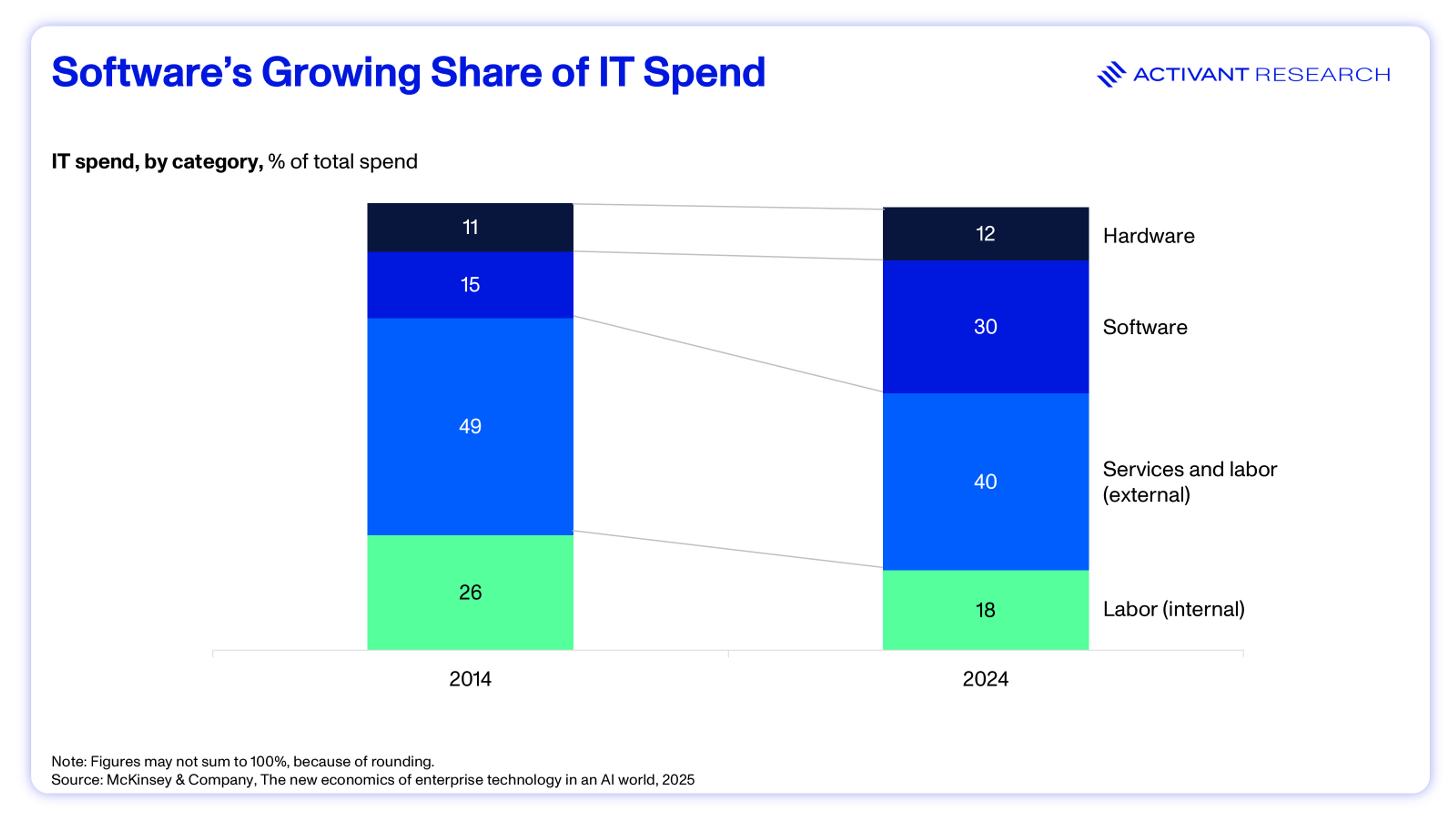 But, this transition to SoIs that we are all so excited for, is bumping up against the entrenched nature of legacy SoRs. Decades of trust and entrenched market share keep these SoRs firmly embedded inside enterprises. Despite the promise of adaptive intelligence, most organizations remain stuck in a state of enterprise inertia, settling for bolt-on AI from incumbents rather than structural change. Under this status quo, we’re likely to see a continuation of the last decade’s trend – a significant increase in IT expenditure without the expected productivity benefit.2
