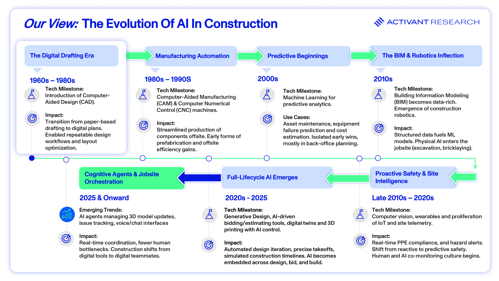The timeline below highlights the various technological changes that we believe have helped pave the way for the introduction of AI within construction.
