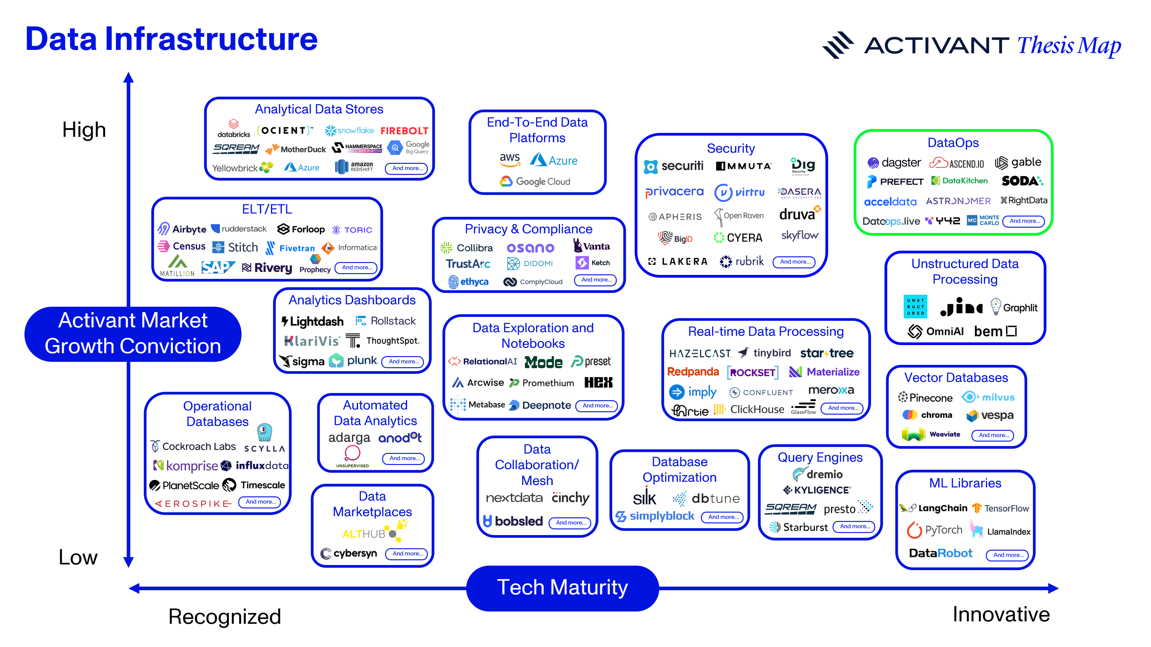 In much the same way that DevOps transformed the software landscape, growing into a $20 billion industry, so DataOps has the potential to become a cornerstone of modern data management. The parallels are clear and the opportunity is immense. We're excited by the companies leading this transformation: Gable is advancing data contracts; Soda and lakeFS are pushing the boundaries of data quality; Acceldata is driving advancements in monitoring; Prefect is streamlining orchestration; RightData, Ascend, and Y42 are innovating in data products; and Dagster is spearheading the implementation of an asset-oriented approach to data management.