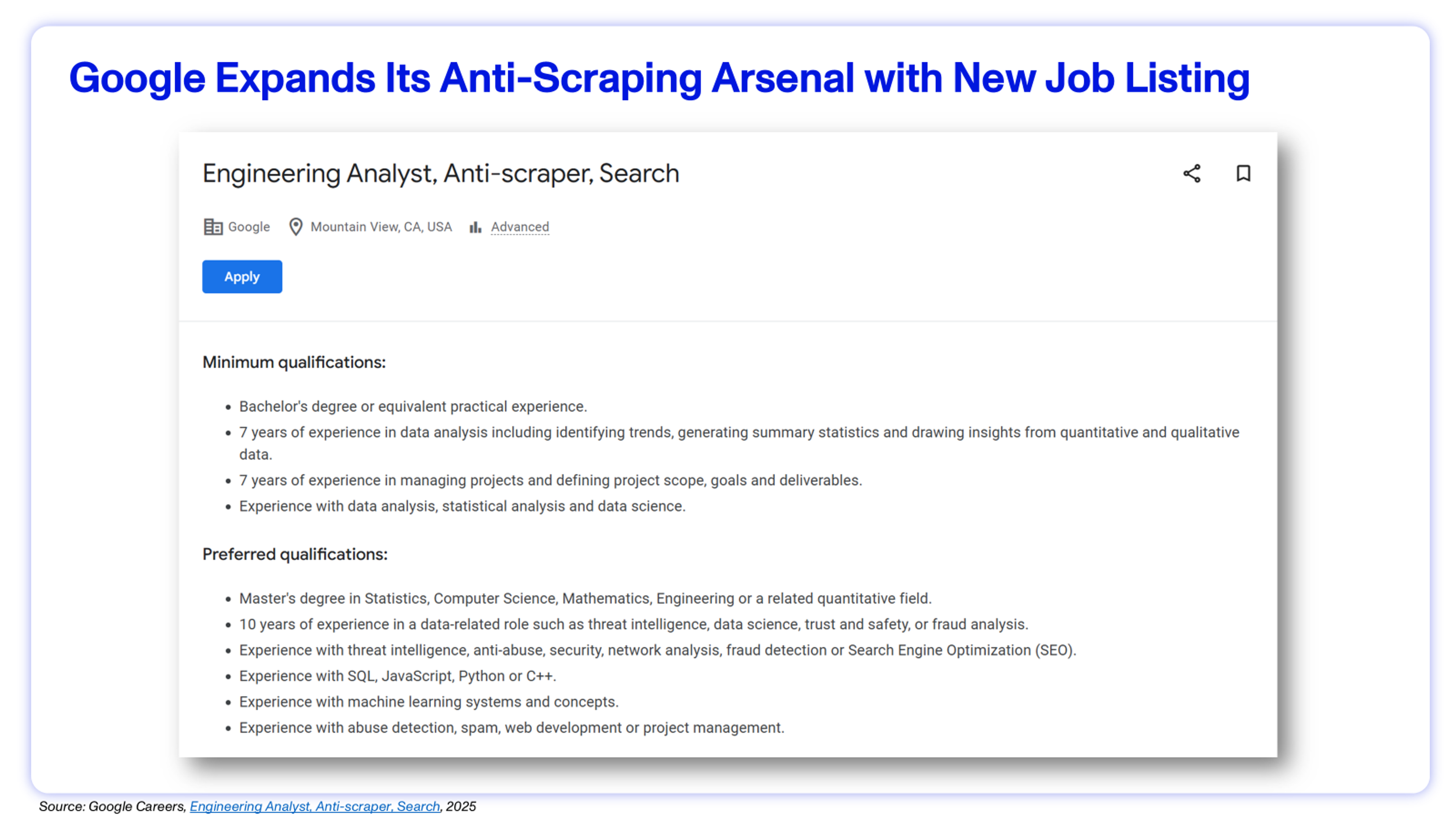 The immediate effect of disabling &num=100 is to restrict bulk retrieval of search results that have long powered SEO tools, competitive intelligence platforms, and AI training pipelines. Historically, scraped result pages have fueled everything from market share trackers to retrieval-augmented generation (RAG) systems. Because Google offers no official Search API with full access to live results, third-party services like SerpAPI emerged to provide this data programmatically. Last year, it was reported that AI firms like OpenAI and Perplexity relied on SerpAPI to fetch live results for real-time answers.5 This change aligns with Google’s broader anti-scraping campaign, which includes hiring for an “Anti-Scraping Engineering Analyst”, deploying tighter CAPTCHAs, and improving bot detection. Together, these actions point to a concerted effort to raise the cost of large-scale data harvesting and preserve the exclusivity of its search data.6