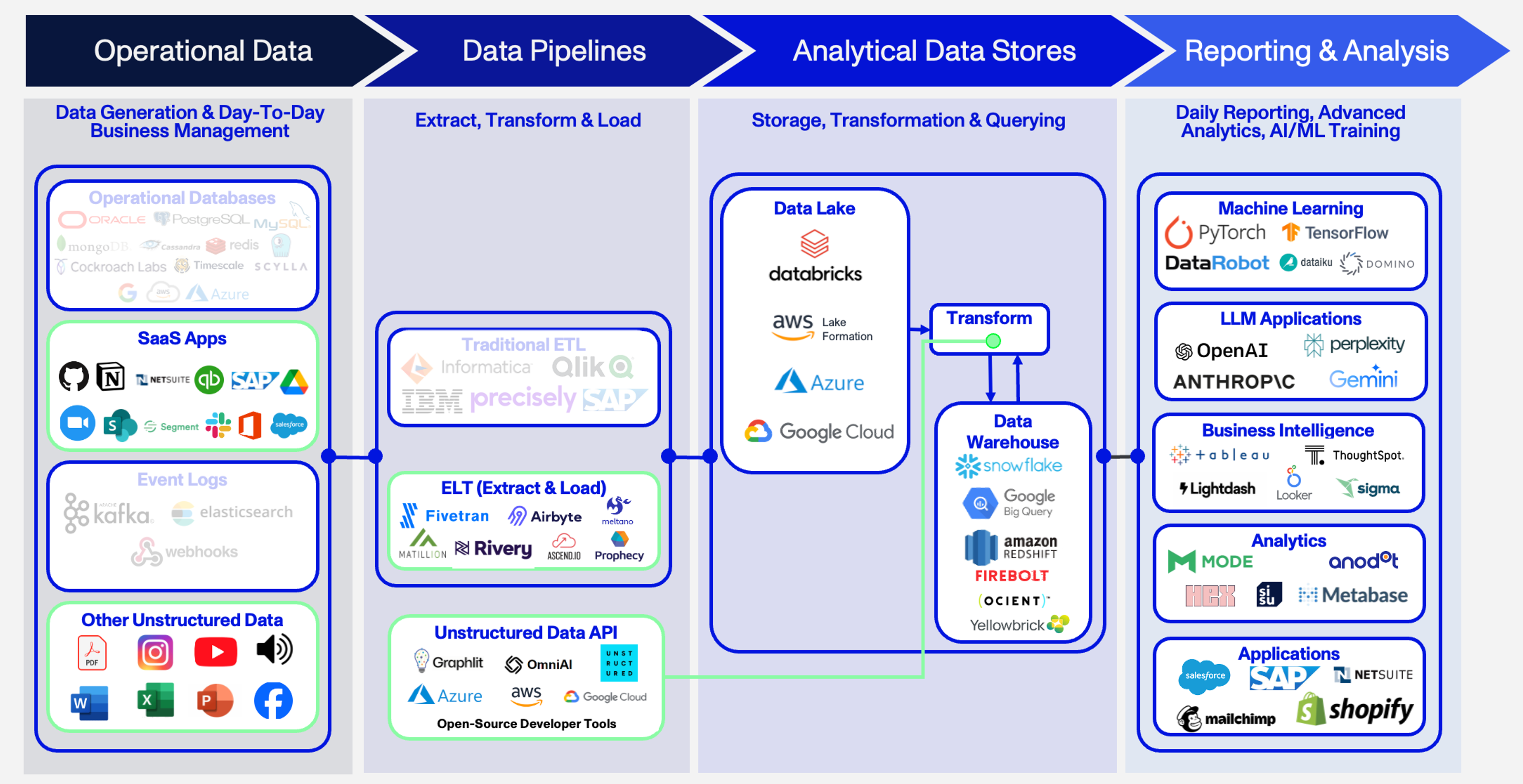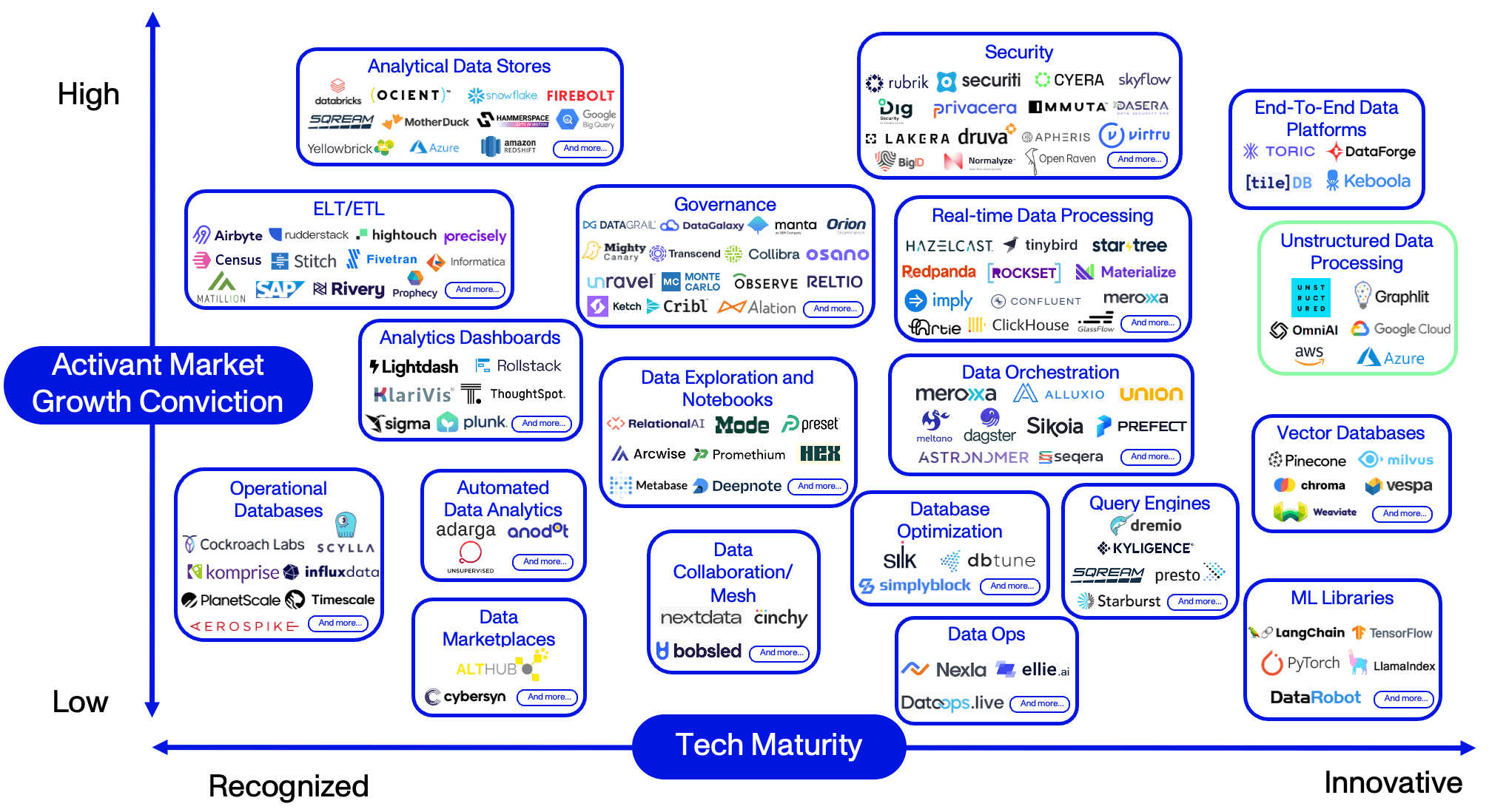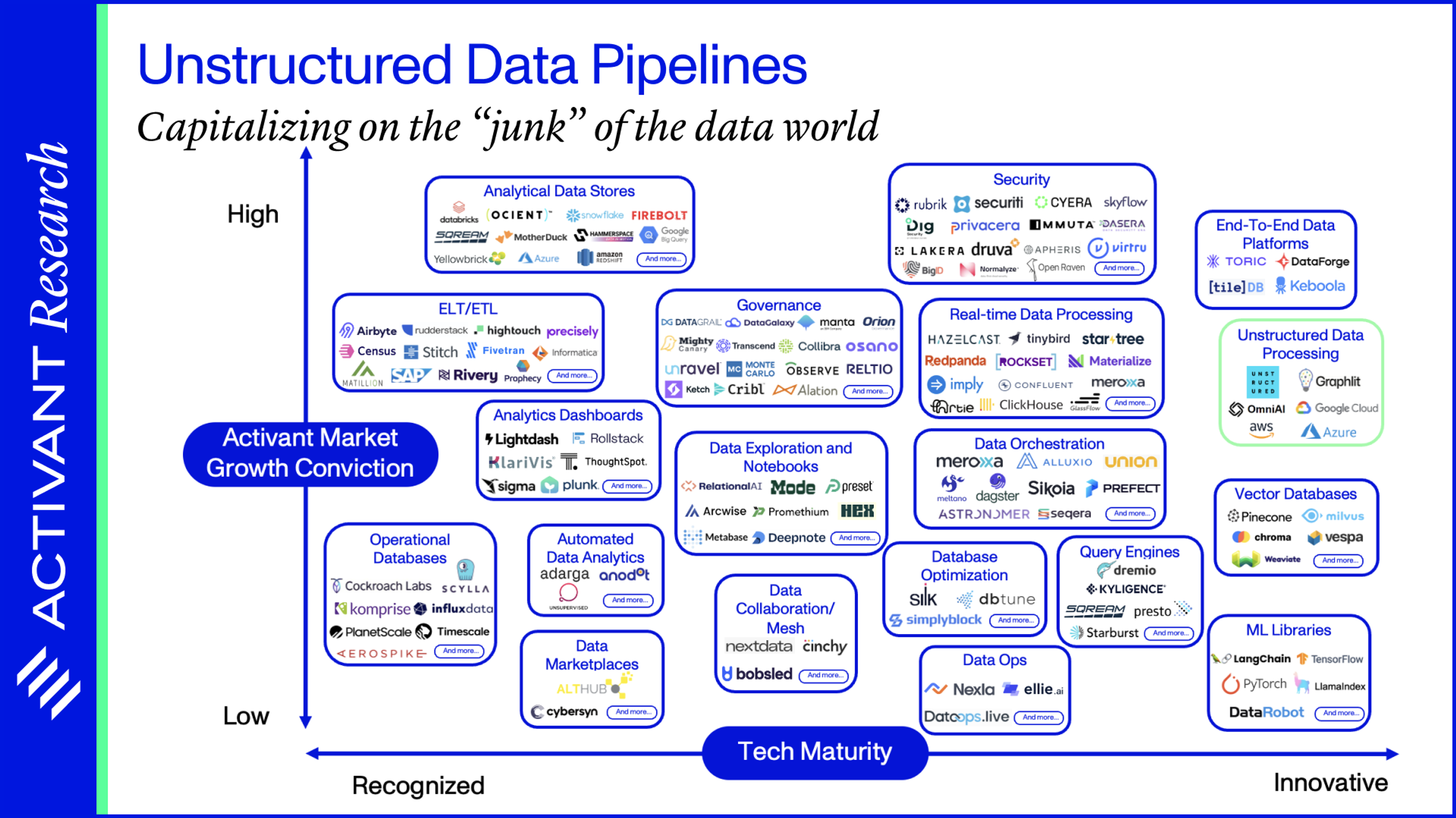 Enterprises are ramping up their infrastructure to keep up with shifting AI trends and unstructured data is becoming increasingly more valuable with each advancement. It remains to be seen whether the winners of unstructured data transformation will be point-solutions or new data pipeline tools. Either way, unstructured data processing tools show great promise in the overall landscape of data infrastructure despite the current small number of contenders. These innovation leaders are outlined in green in the Activant Data Infrastructure Thesis Map which arrays emerging solutions on technical maturity – from recognized to innovative solutions – and Activant’s market growth conviction.