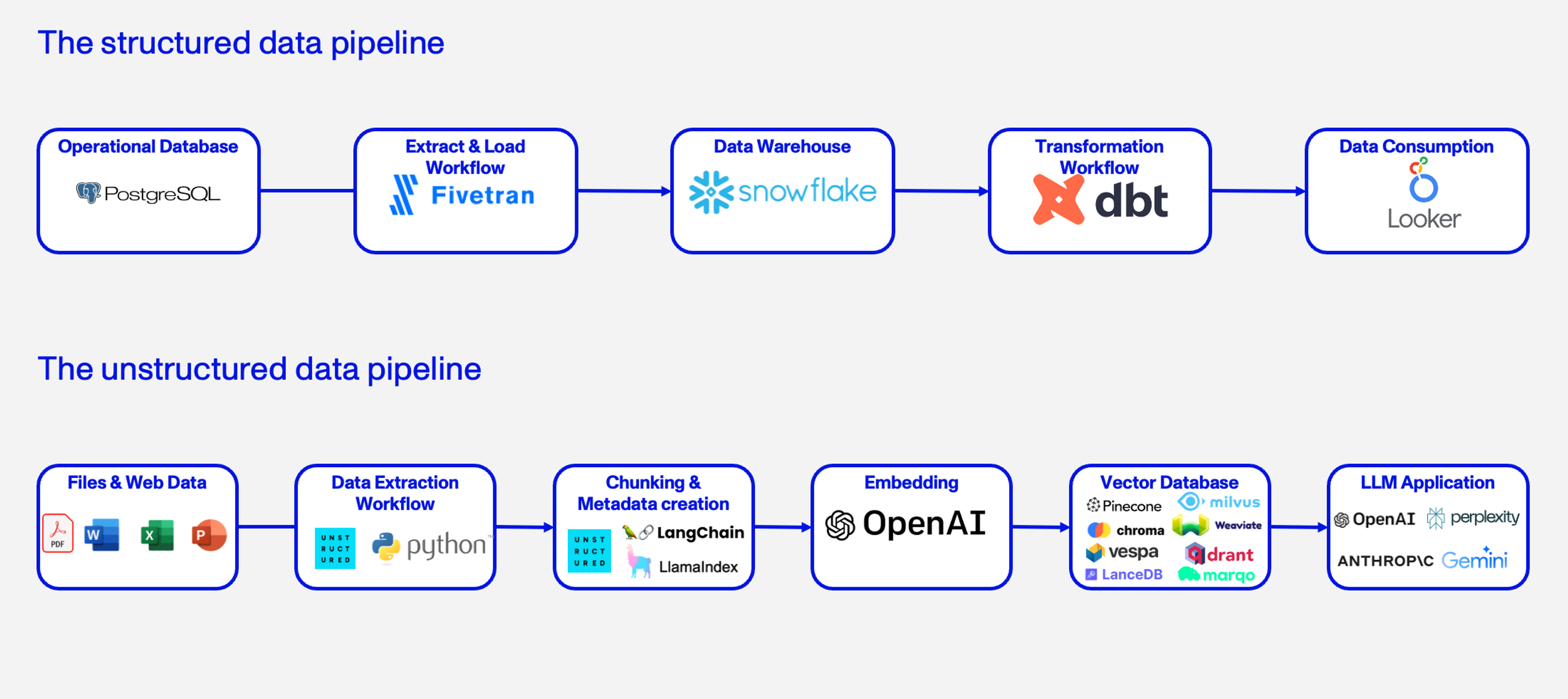 This presents a straightforward solution for those with established data pipelines, but it may not be that simple. In 2023, 40% of organizations reported difficulties integrating unstructured data technology with existing tools.2 For new LLM-centric companies or new projects in existing companies, there is potential for a new data pipeline focused solely on unstructured data and the critical tasks needed to get it LLM-ready.