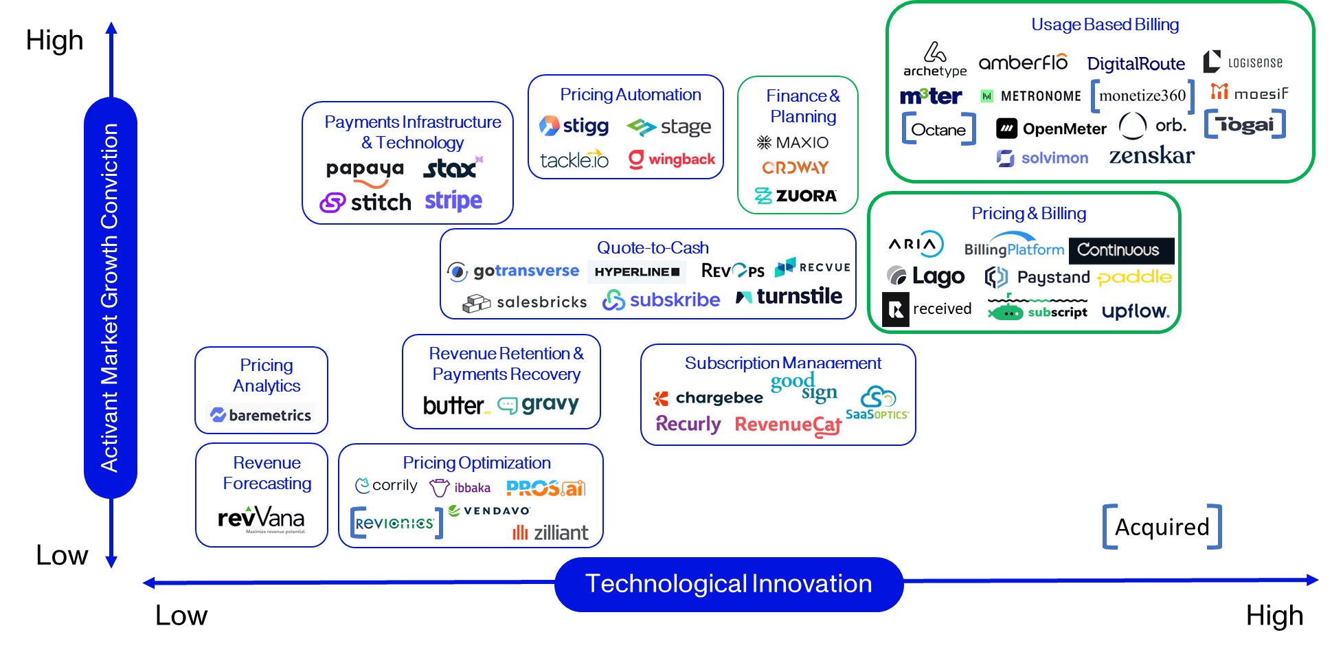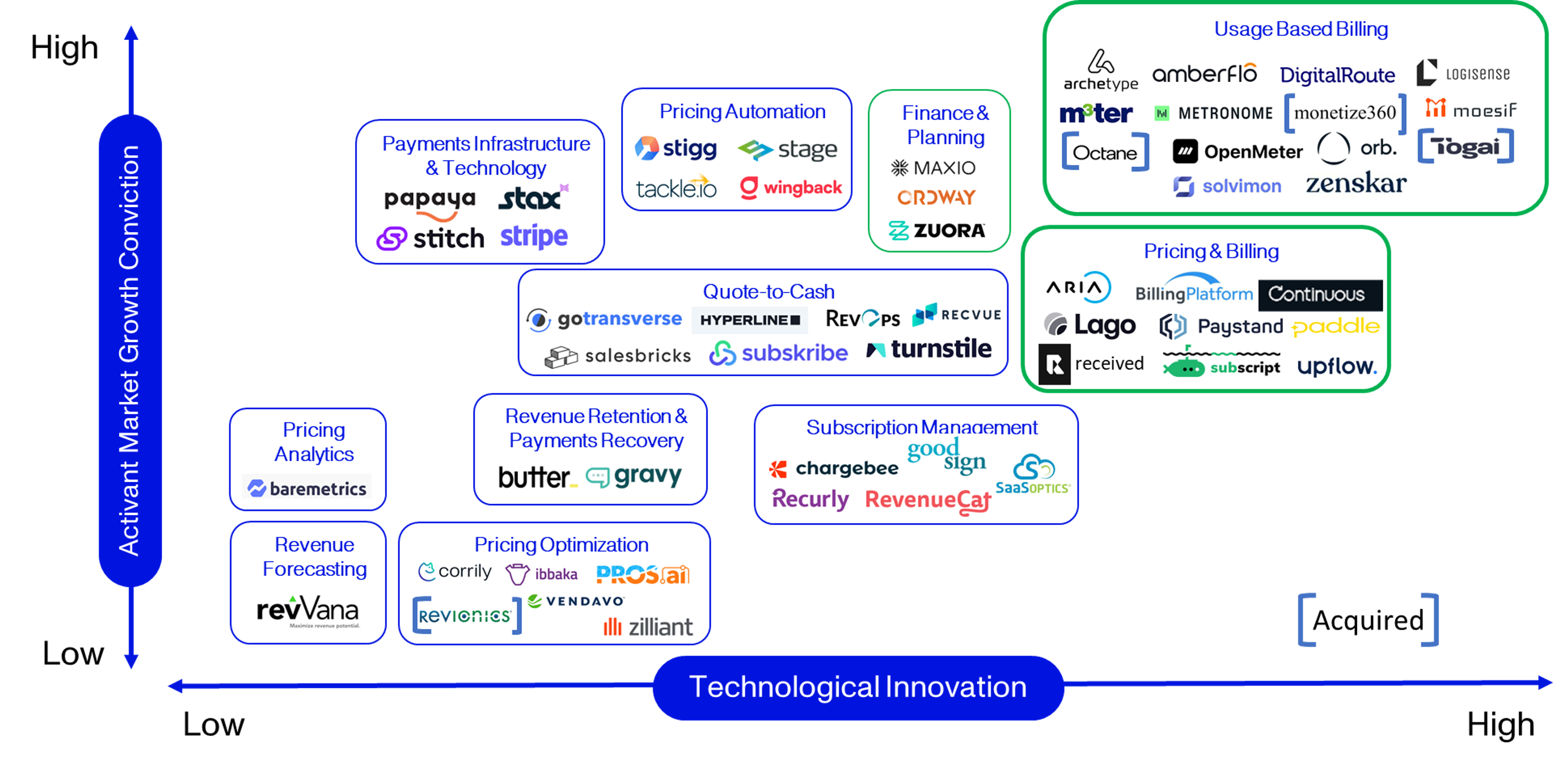 Our Activant thesis map, shown below, summarizes our market growth conviction and assessment of the degree of technological innovation for each of the distinct clusters of companies. We are most excited about the growth prospects of the UBB, Pricing & Billing, and Finance & Planning segments as these have the greatest exposure to core UBB functionality and application.