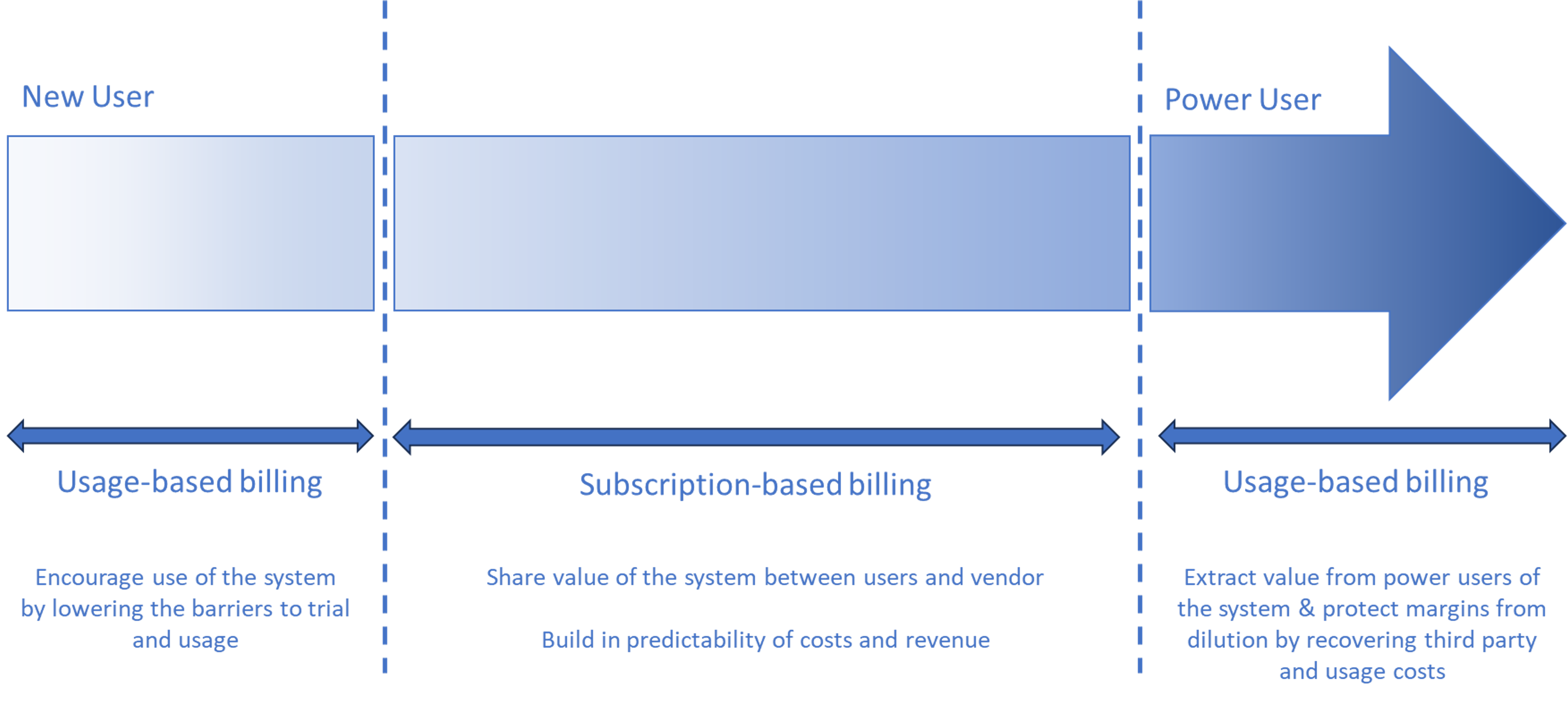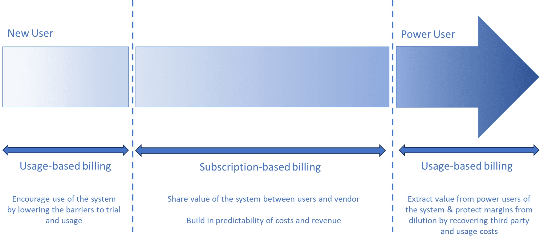 One of the reasons we believe that hybrid pricing models are the future of SaaS is the change in needs and usage along the customer journey. Customers often need incentives to try new products and vendors should do everything in their power to lower the barriers to trial and usage. At this stage it makes sense to offer UBB terms over per-seat subscription fees as the value typically accrues to new users. Once customers are comfortable with the product and see the value, it is easier to have the conversation around subscription contracts, which provide cost certainty for the users and revenue predictability for the vendors. These contracts are, on average, fair to both parties but the equation breaks down as the ratio of power users increases. This is particularly true if the vendor must absorb usage-based costs such as compute or third-party fees and royalties for embedded software or models. In these instances, UBB again makes more sense to recover some costs from power users (or machines) and protect margins. Hybrid pricing models address this challenge and align the interests of both parties along the customer journey.