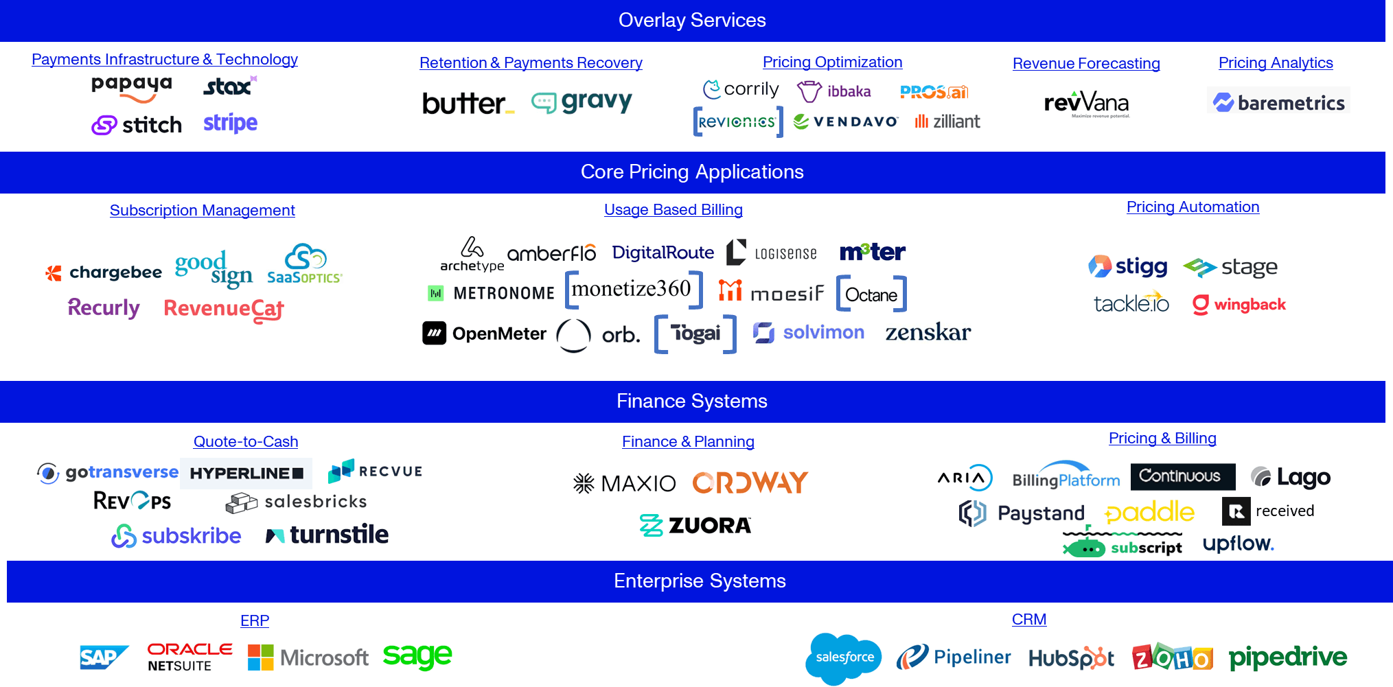 We think of the pricing market landscape as a series of layers that build upon one another as required. At the base there are the core enterprise systems that often have much of the pricing functionality required, and above this are the core finance systems that organizations may use. This will include (QTC systems, finance and planning tools, as well as pricing and billing applications. Beyond this, we consider core pricing applications — subscription management systems, UBB applications, and pricing automation solutions — and finally, the overlay services that add incremental value.