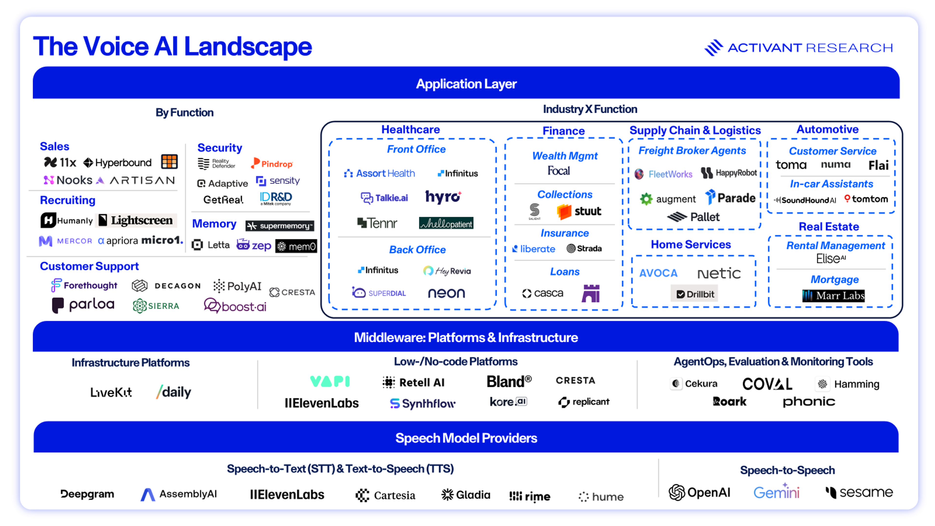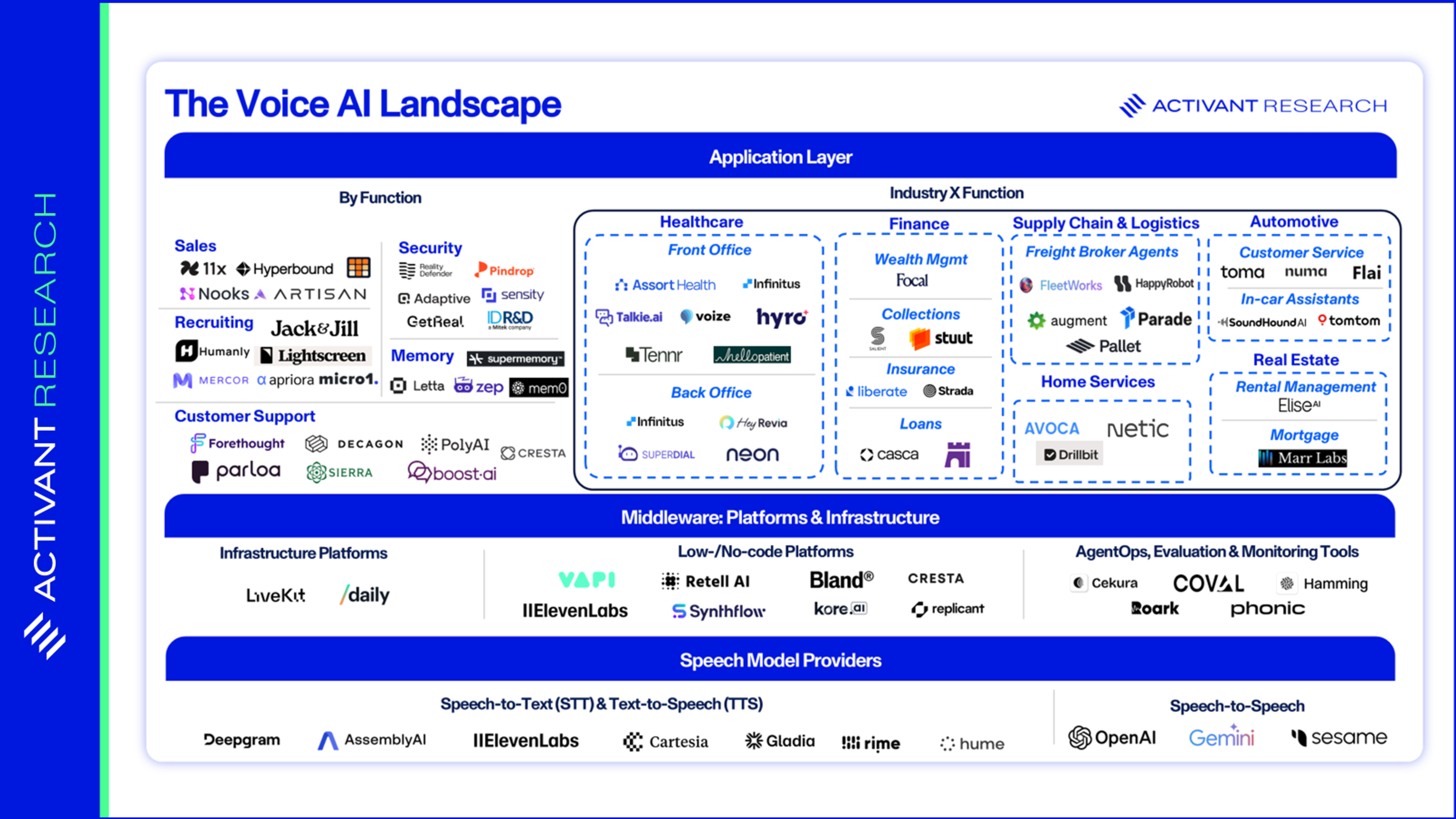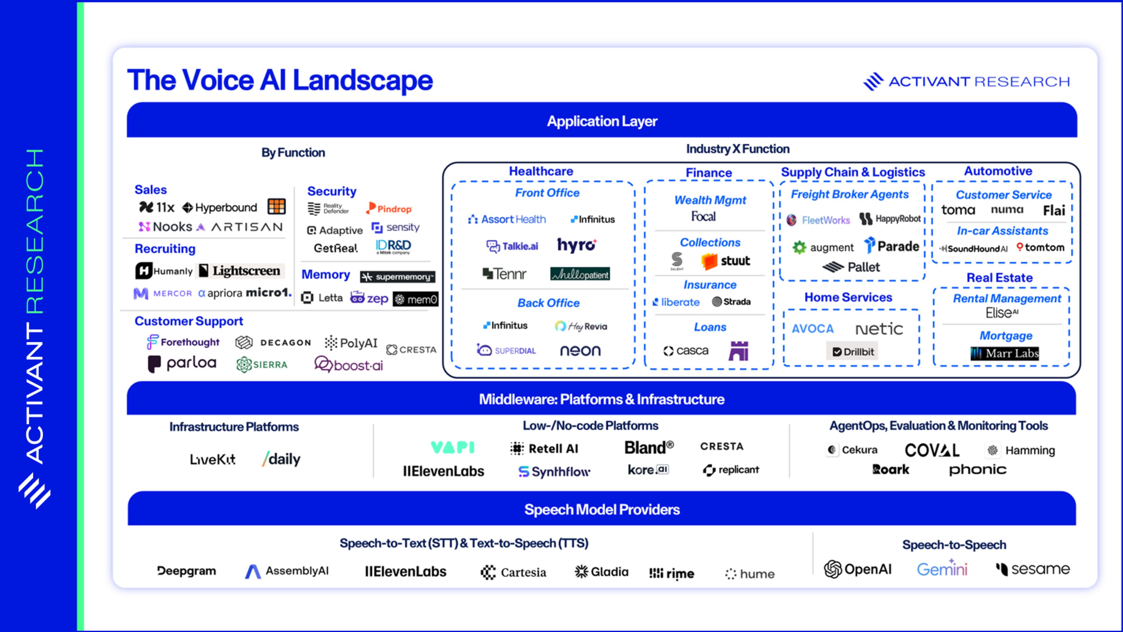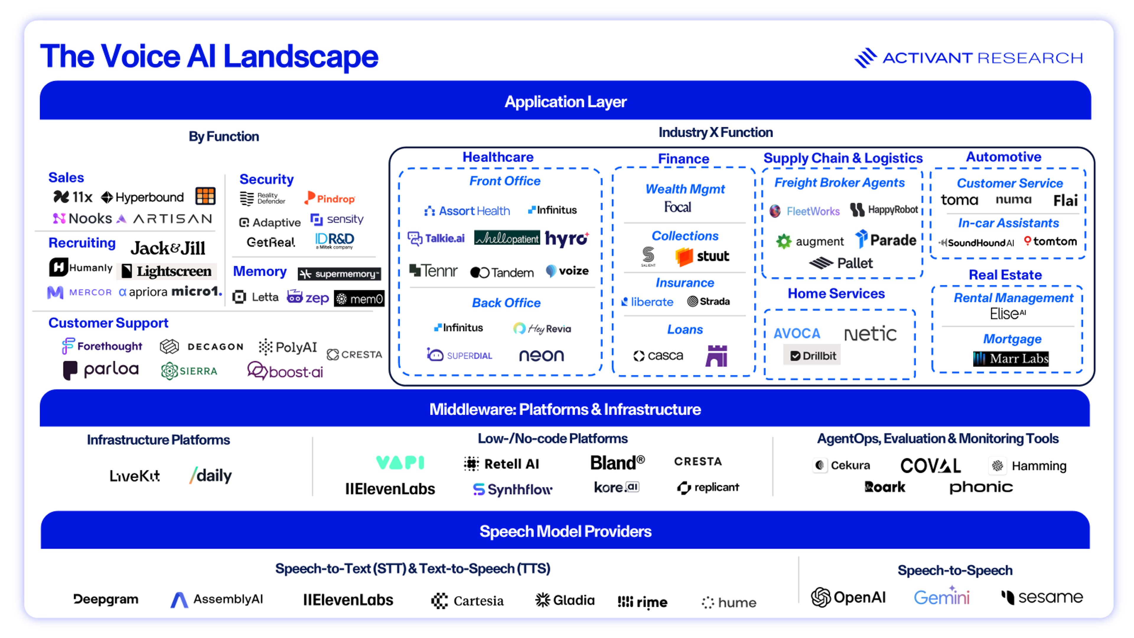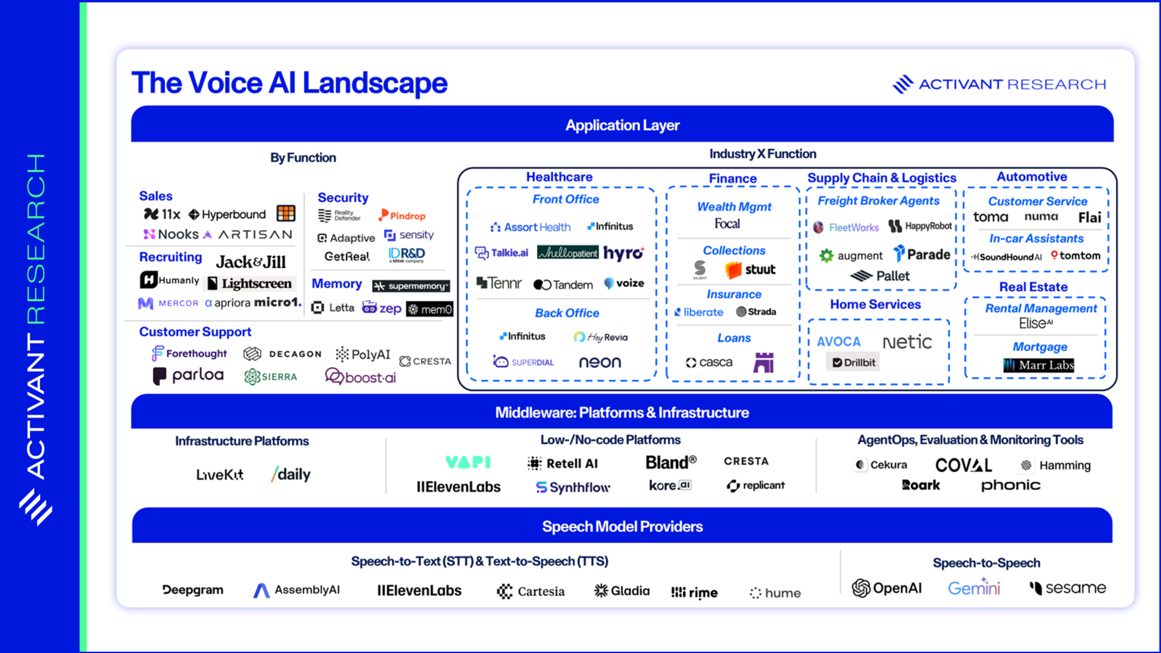 At Activant, we believe Voice AI will permeate daily life, from ordering takeout and scheduling appointments to job interviews and even companionship, but success hinges on clear market strategy. Vendors that remain point solutions risk being commoditized. Durable players will either own the stack (controlling performance and cost end-to-end), move up the stack (embedding memory, orchestration, compliance), or verticalize (integrating directly into industry workflows).
