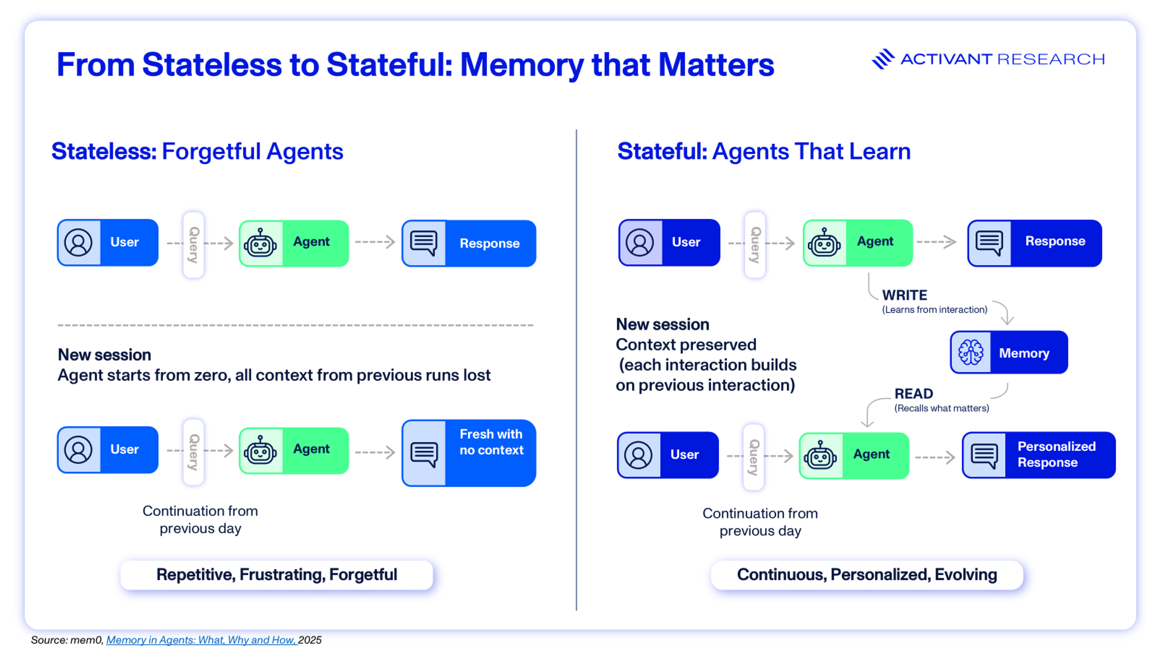 Rather than treating every interaction as a one-off exchange, memory creates a persistent internal state that evolves with use. This allows agents to capture user preferences, past decisions, and long-term context, sustaining continuity across weeks or months. Unlike RAG, which grounds responses in external data at inference but remains stateless, memory provides persistent awareness of identity and history. This transforms AI from a transactional tool into a relationship-based system, positioning it as the backbone for next-generation customer engagement, productivity, and enterprise applications.