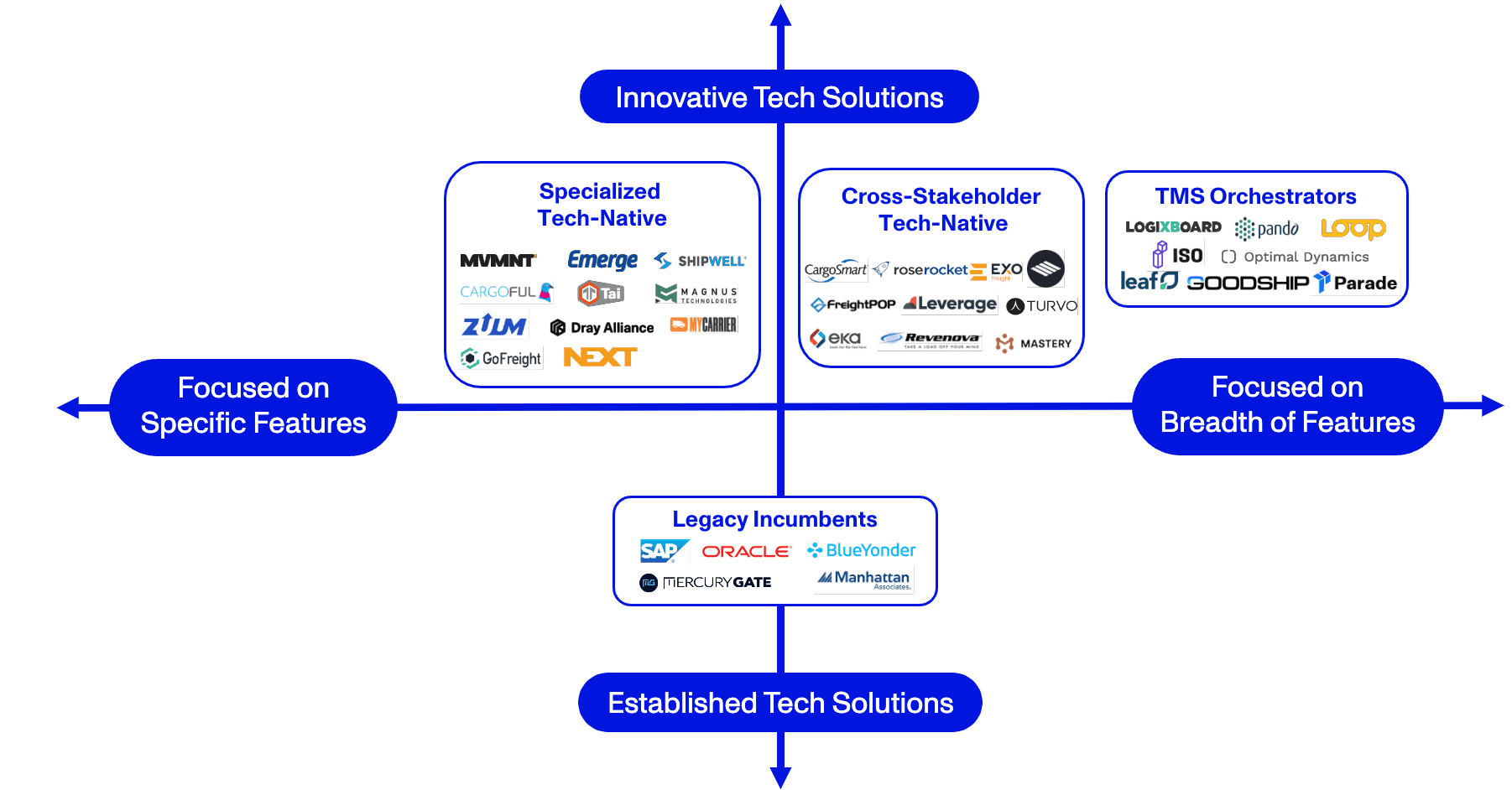 These vendors aim to provide solutions for different stakeholders (e.g. shippers, carriers, brokers, forwarders, 3PLs, NVOCCs). They often start with one key relationship, which in turn generates a client-driven cross-sell. The strength of these products is in their cross-sell potential, which in turn can lead to network effects between stakeholders. However, in building for multiple parties, this approach risks creating misaligned incentives in product-market fit – where multiple parties have different product requirements. This segment ties most closely to the "Cross-Stakeholder Tech-Natives" segment in our Activant TMS Market Map.