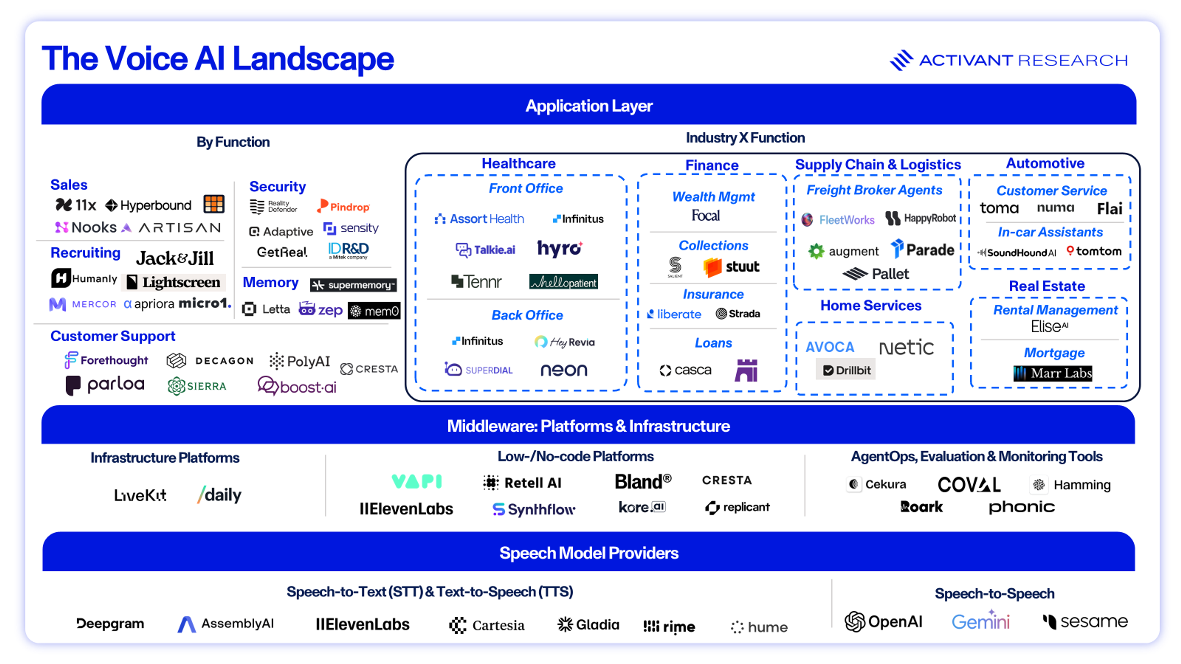 At Activant, we believe Voice AI will permeate daily life, from ordering takeout and scheduling appointments to job interviews and even companionship, but success hinges on clear market strategy. Vendors that remain point solutions risk being commoditized. Durable players will either own the stack (controlling performance and cost end-to-end), move up the stack (embedding memory, orchestration, compliance), or verticalize (integrating directly into industry workflows).